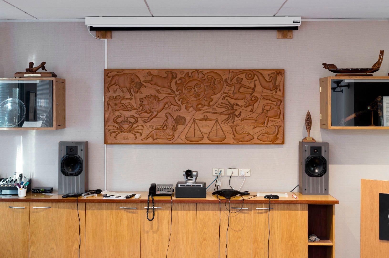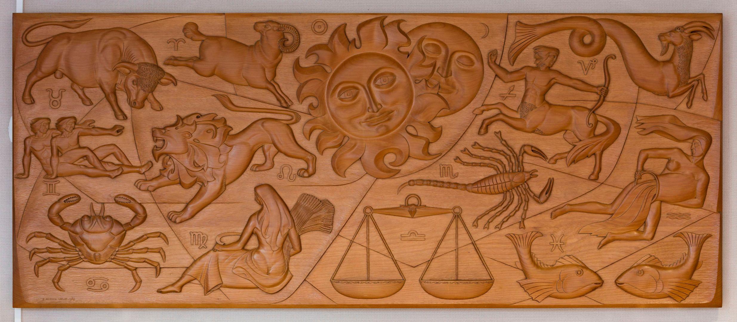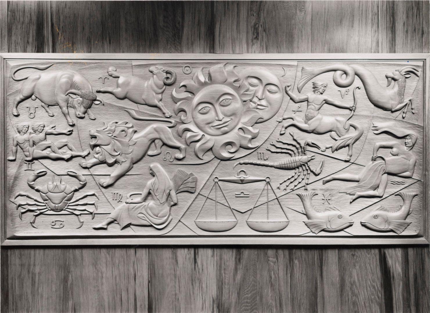 Through low relief carvings of the sun and moon surrounded by zodiac signs, Taylor imagined radio waves penetrating the ‘heavens’, alluding to some of his previous engravings particularly those concerning Māori myths and legends. Kauri was selected due to its warm sheen and colour, contrasting with the rimu timber paneling in the building’s foyer, and Taylor spent a total of 700 hours completing the work.