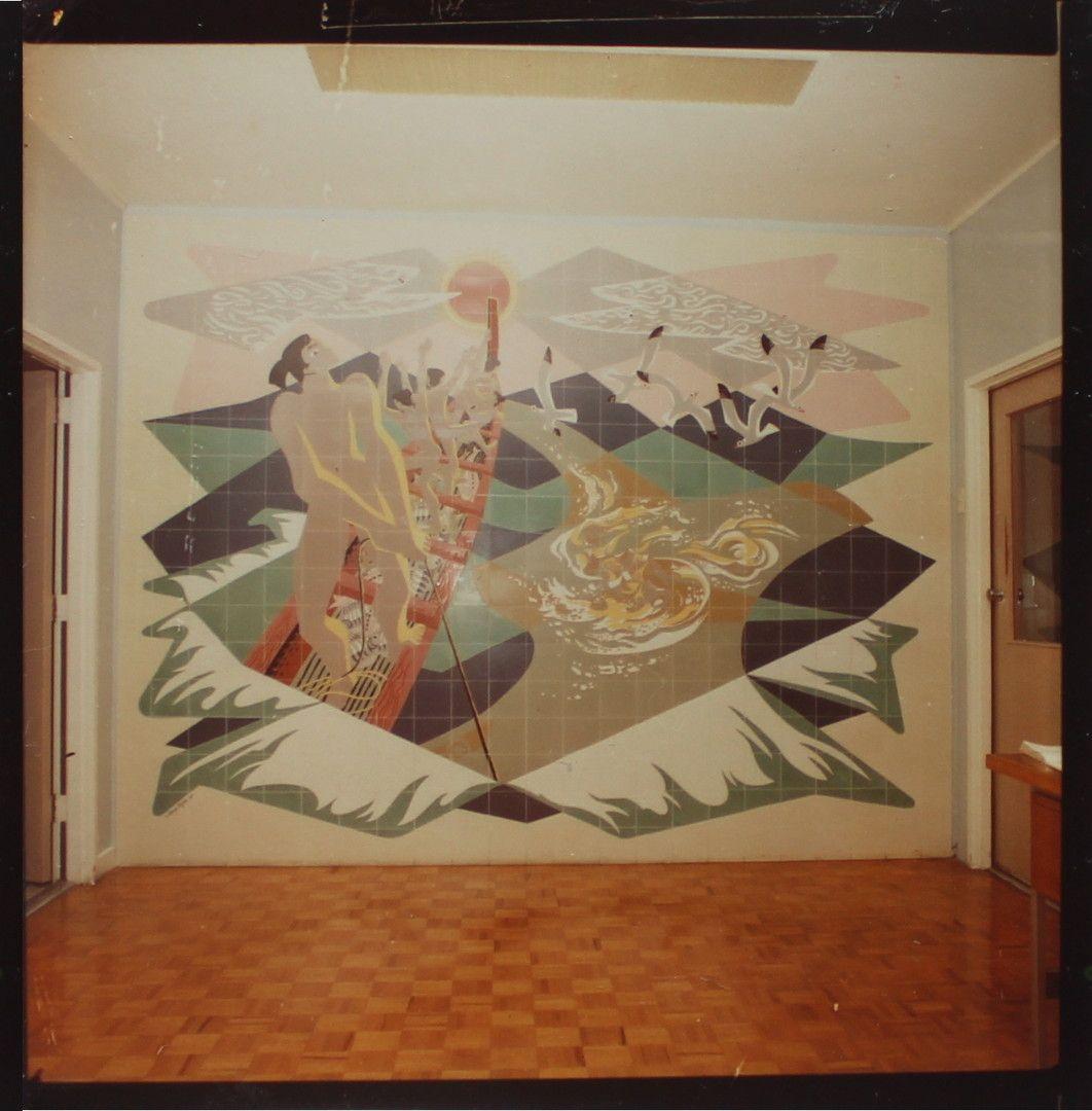 Taylor responded to the idea of the cable with a metaphor distinct to Aotearoa: the traditional Māori creation story of the demi-god Māui fishing up the North Island, also known as Te Ika-a-Māui (the fish of Māui). A press release about the mural at the time stated, “there was an analogy, [Taylor] thought, between the ‘fishing up’ of New Zealand by Maui and its modern counterpart where the new cable again draws New Zealand out of the Pacific into the telephone systems of the world.”[1]