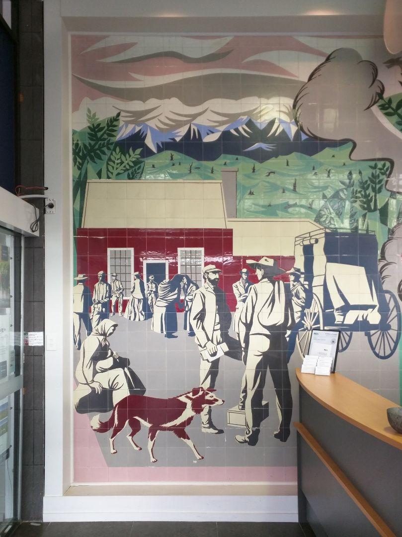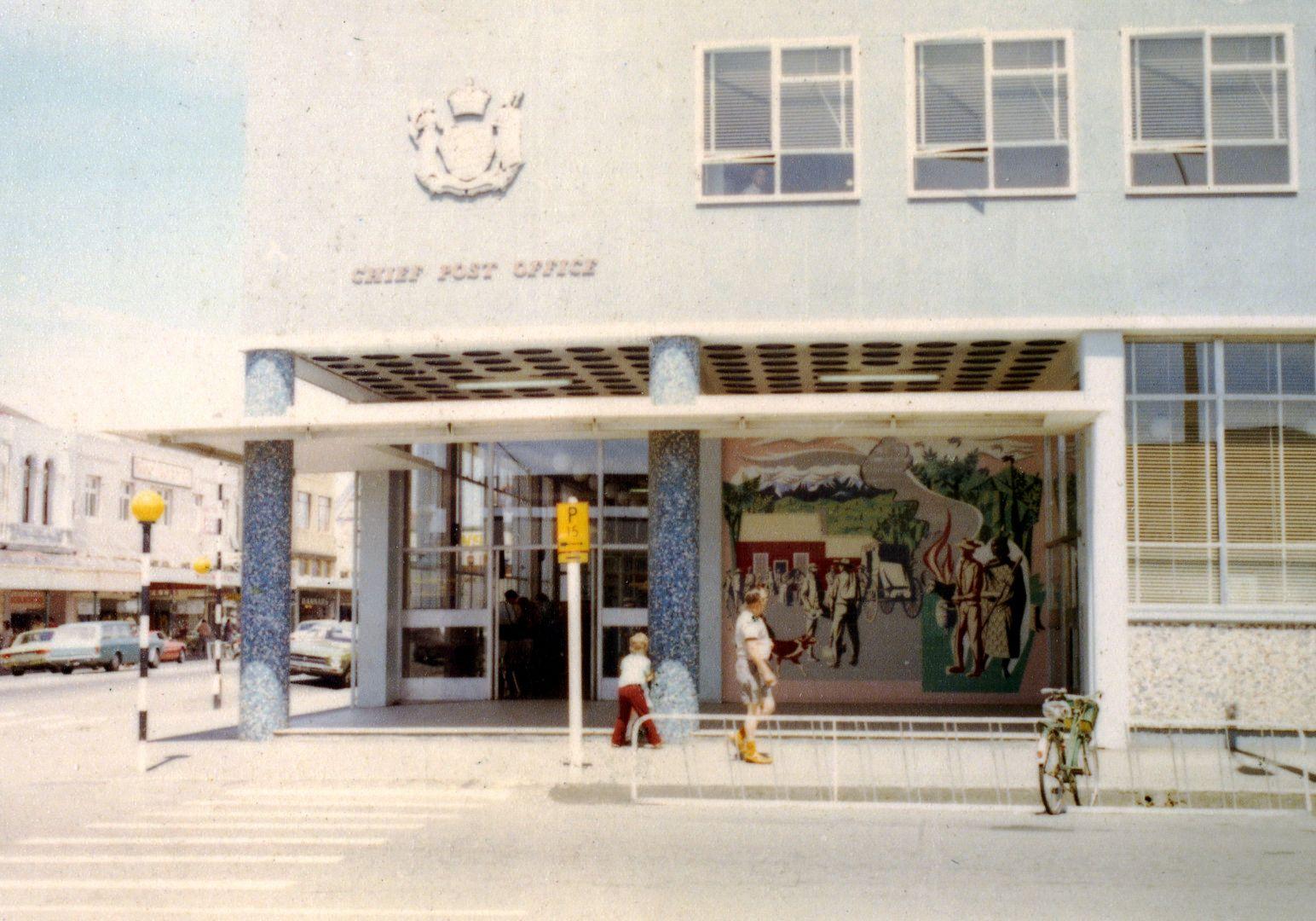 In the early 1960s E. Mervyn Taylor was commissioned by Government Architect Gordon Wilson to create a mural for the portico of a new Post Office being developed for Masterton. The resulting ceramic tile work, Early Settlers, was unveiled at the opening of the new Chief Post Office in 1962.