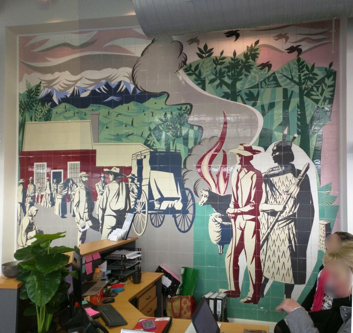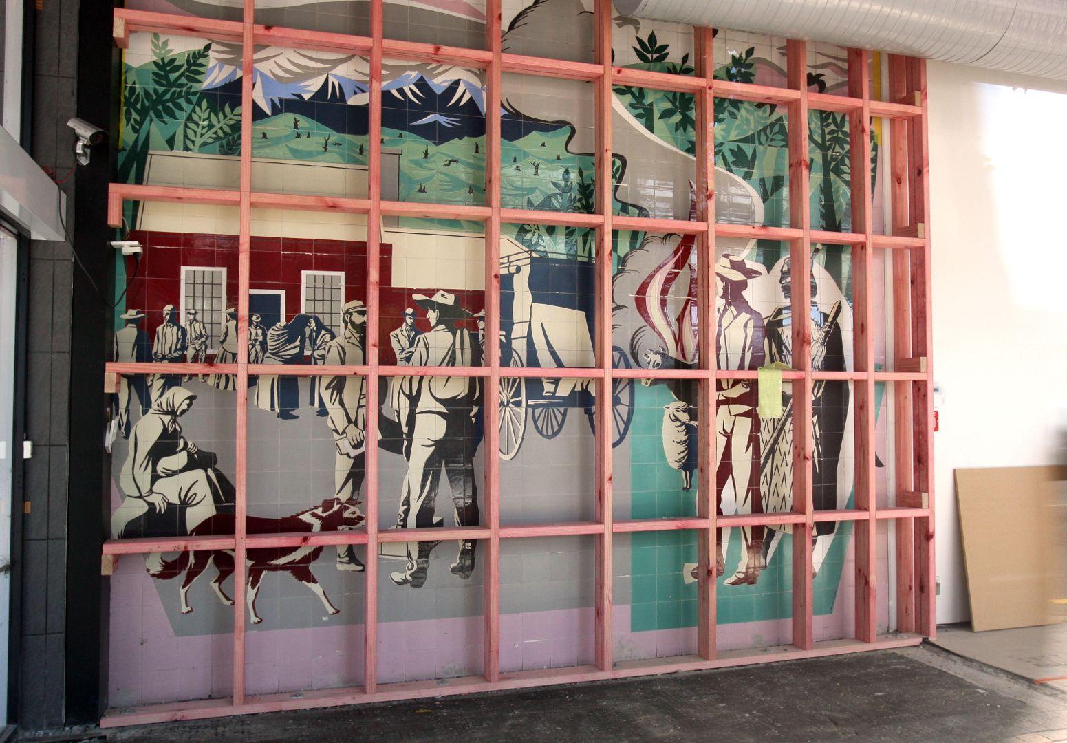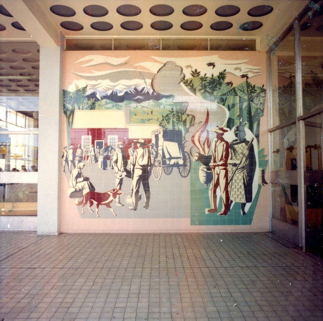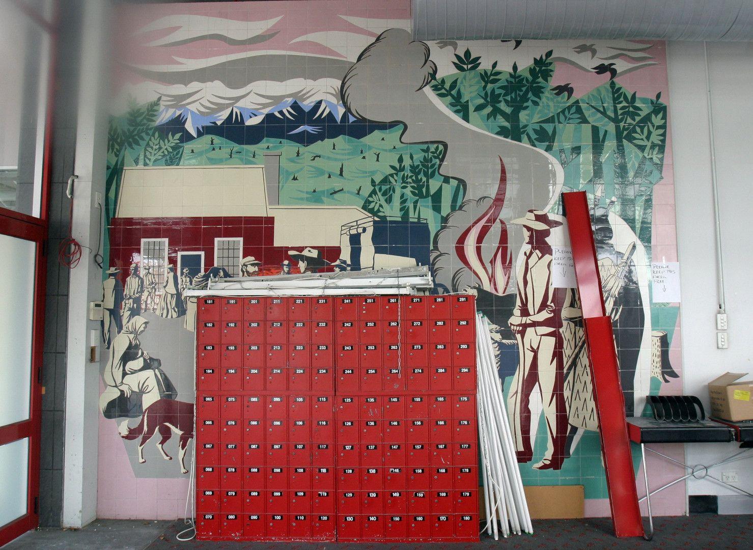 The history of the mural has been no less complex. During the Post Office’s occupancy of the building, the portico was enclosed and Post Office boxes were placed in front of the mural. Later, after New Zealand Post had sold and vacated the building, retailers came in to the space and in 2013 a wall was built in front of the mural. The mural remained hidden until 2018, when the building’s new owner had the wall removed and returned the mural to public display.