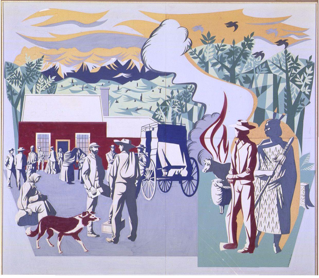A contemporary viewing of this mural, however, touches upon a much wider narrative of land dispossession and the loss of what was known as 70-mile bush, Te Tapere ui a Whātonga, a forest that stretched from Masterton to Hawkes Bay. Taylor would have been aware of this history, which may explain why the taiaha is depicted ready for battle whereas the axe, with the forest nearly gone, is resting head down. Although both Maori and Pākehā are present, there is no interaction between the two.