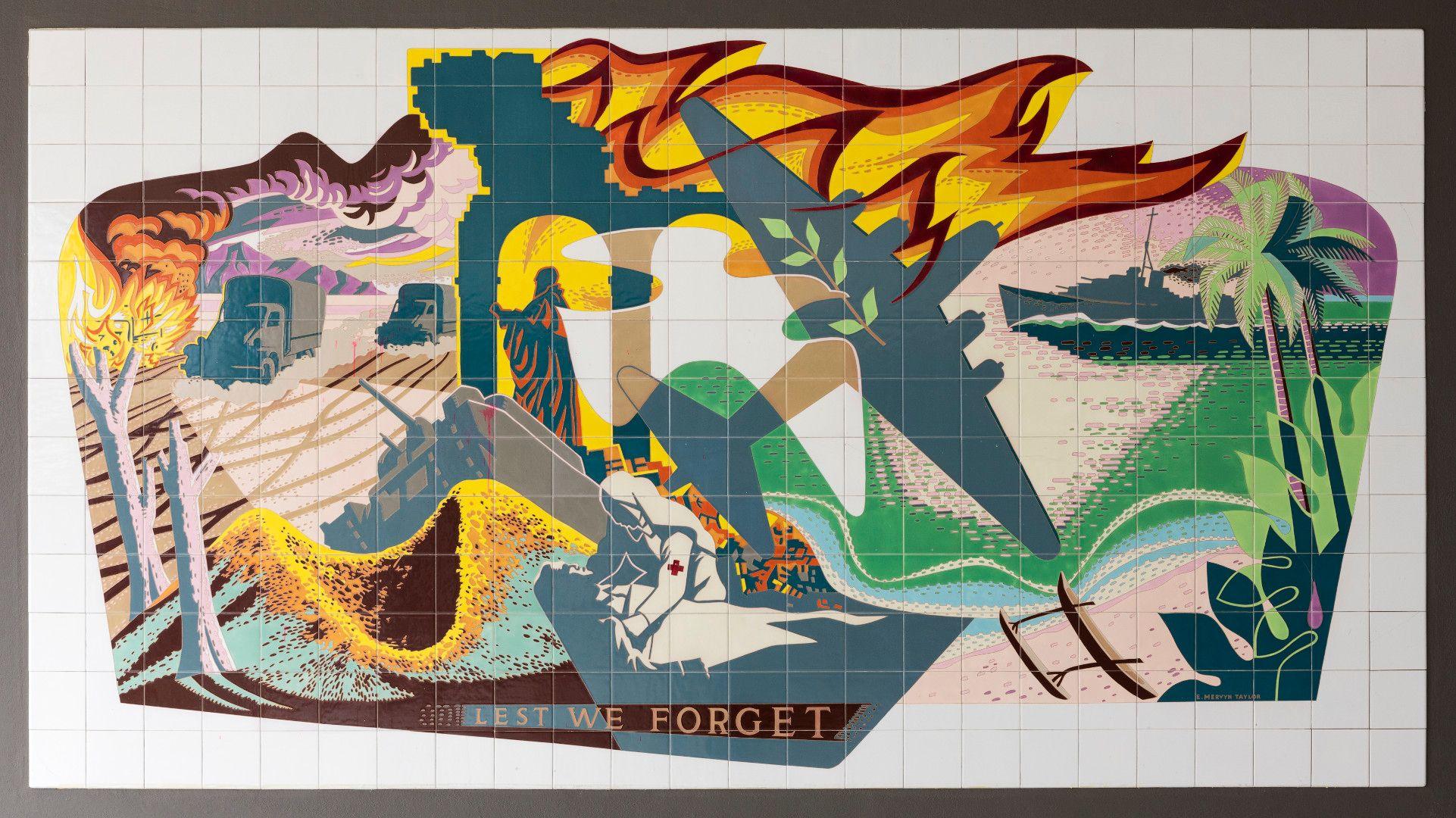 Text adapted from Gareth Winter’s essay “Lest We Forget: The Battle for the Mural” in Wanted: The Search for the Modernist Murals of E. Mervyn Taylor (Massey Press, 2018).