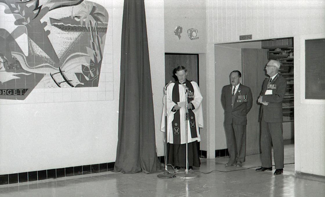 The NZ agent for Muranite, dismissed the criticism as ‘exaggerated’, but conceded that the toning down of some of the colours, combined with some lines not being as well defined as they should have been, had reduced the desired clean impression. Daniell & Wevers were not prepared to accept a ‘patched up’ mural, saying a complete replacement was the only sensible option. A stand-off ensued. The council’s solicitor became involved. Finally, by March 1964, Smith & Smith, Taylor and the Council had resolved to replace the mosaic with ceramic tiles mural manufactured by Carter & Co. of England. Tragically, Taylor died in June 1964. His wife, Teddy, arranged a revised design for the mural based on Taylor’s existing drawings. The tiles were finally installed in March 1966 just prior to being unveiled on Anzac Day, nearly 21 years after the end of the war they memorialised.