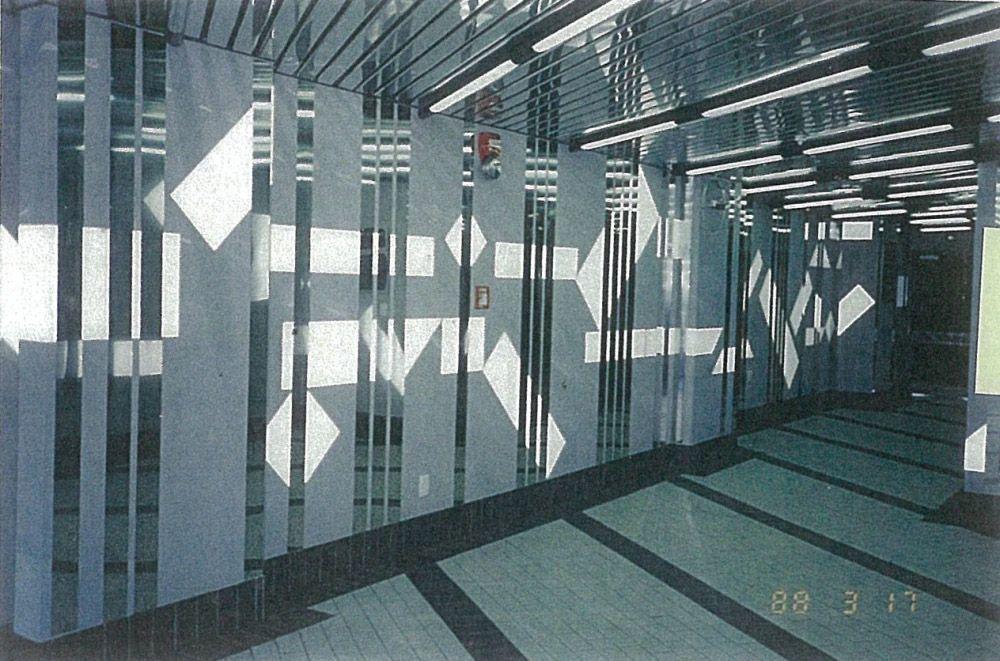 Guy Ngan’s 'Data General [mural]' extended along the corridors of a commercial building in central Wellington. Optically challenging as an artwork, rectangles of 3M reflective adhesive dance up and down the walls, punctuated by stainless steel strips. Horizontal and vertical lines collide, enhanced by fluorescent lighting strips on a reflective ceiling. Ngan’s idea was to bring in some light to an otherwise dark entrance way.