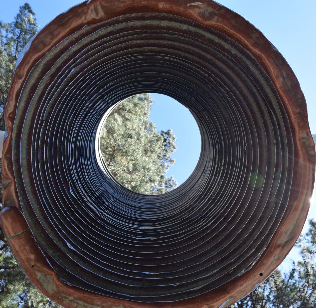 “Take some time to explore this sculpture. So finely balanced is the coil of copper tubing that a small push will set it moving. It sounds like a gong when tapped. The funnel focuses the sounds of the city for those who stand inside. The artist wants you to grab it, look through it, listen and enjoy its movement, especially on windy days.