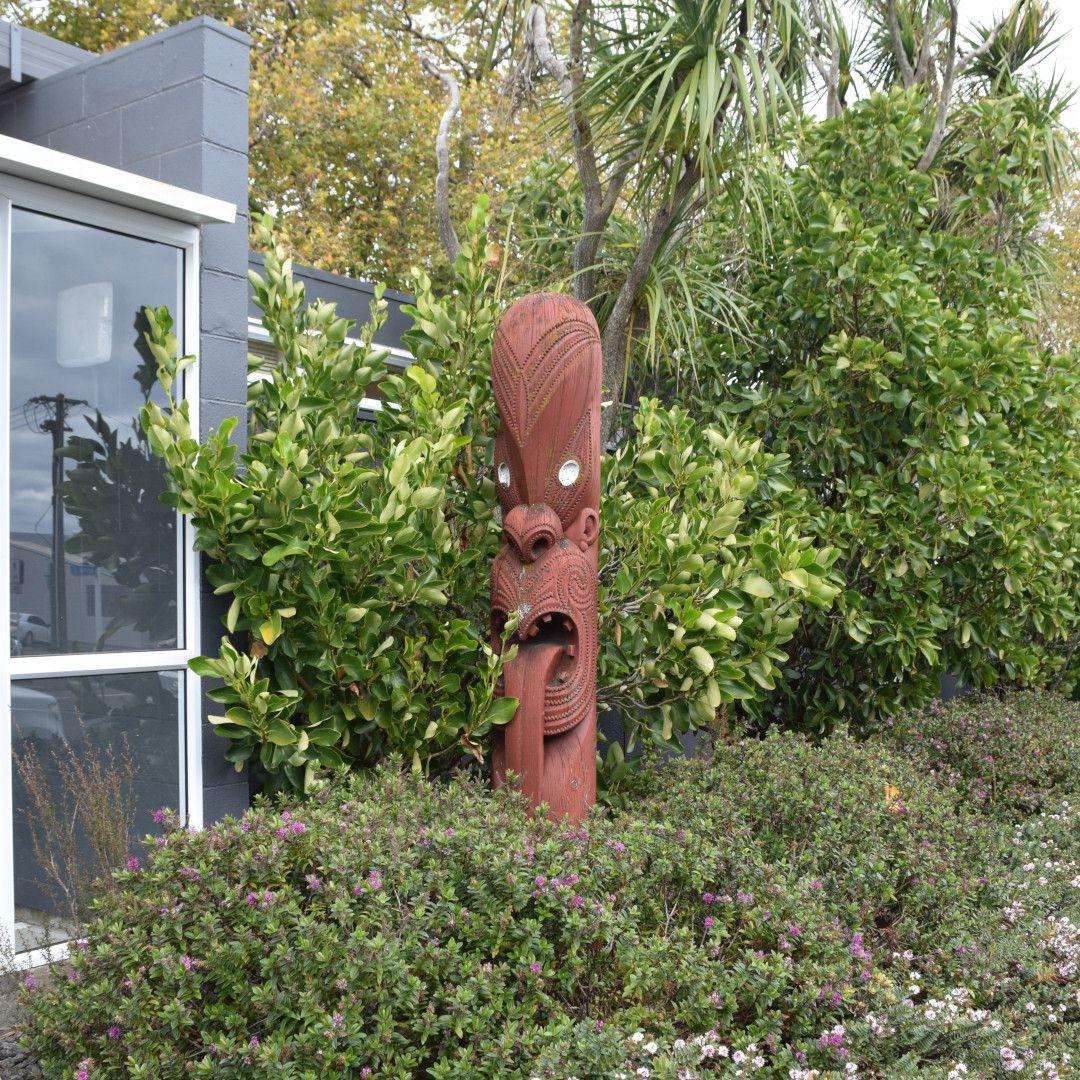 Tucked in amongst the plantings near the Whanganui District Court, this carve pou was hewn from macrocarpa by local sculptor Austin Brasell. The piece was commissioned to celebrated the opening of the Whanganui iSite Visitor Centre in the 1980s.