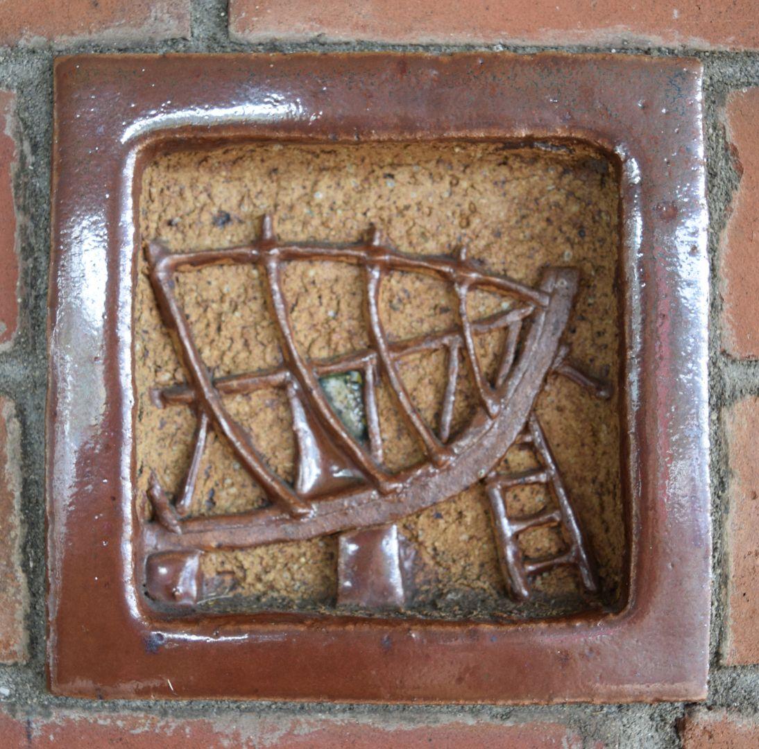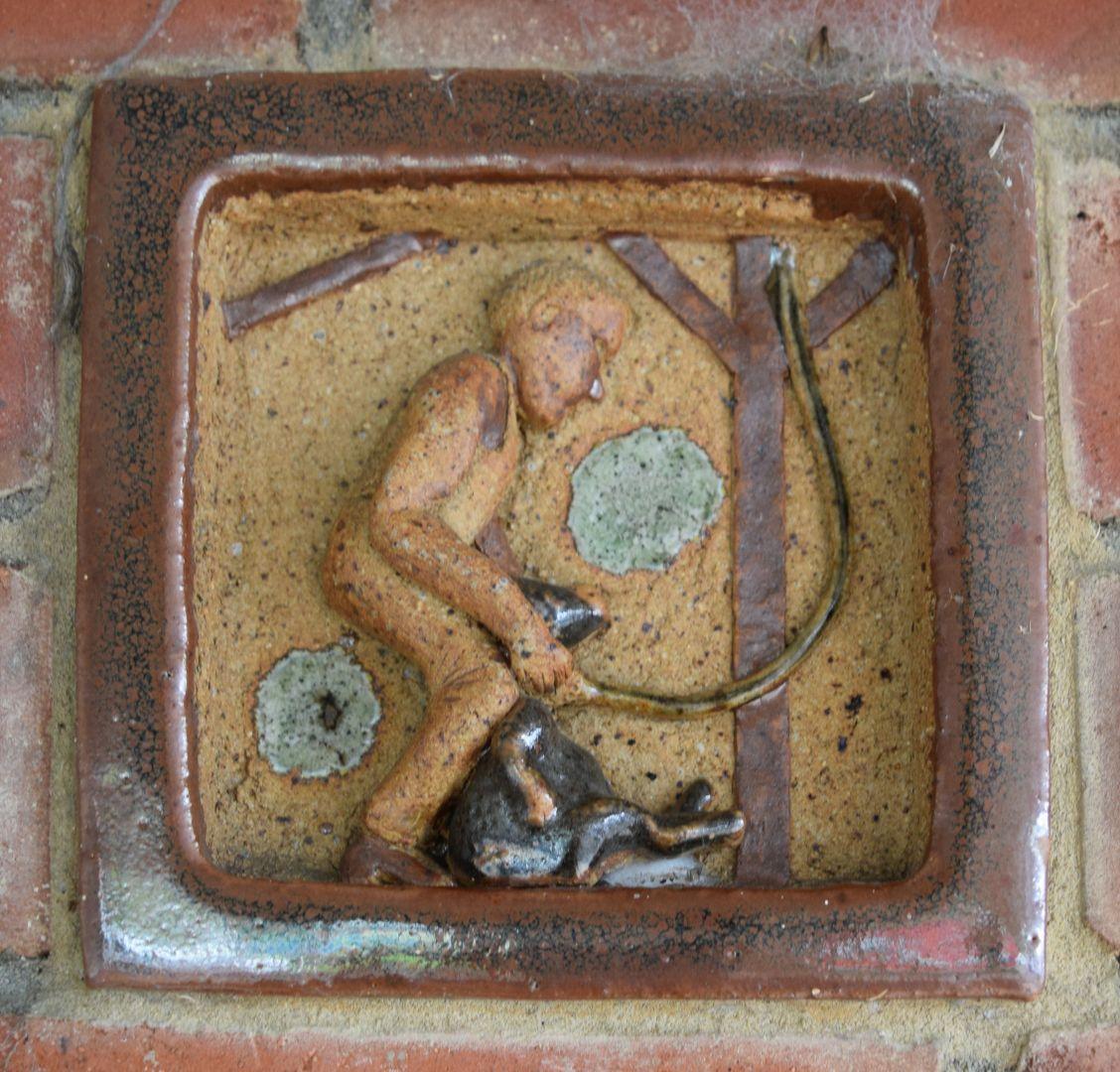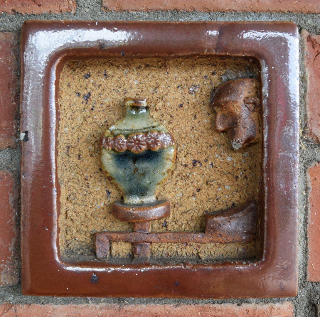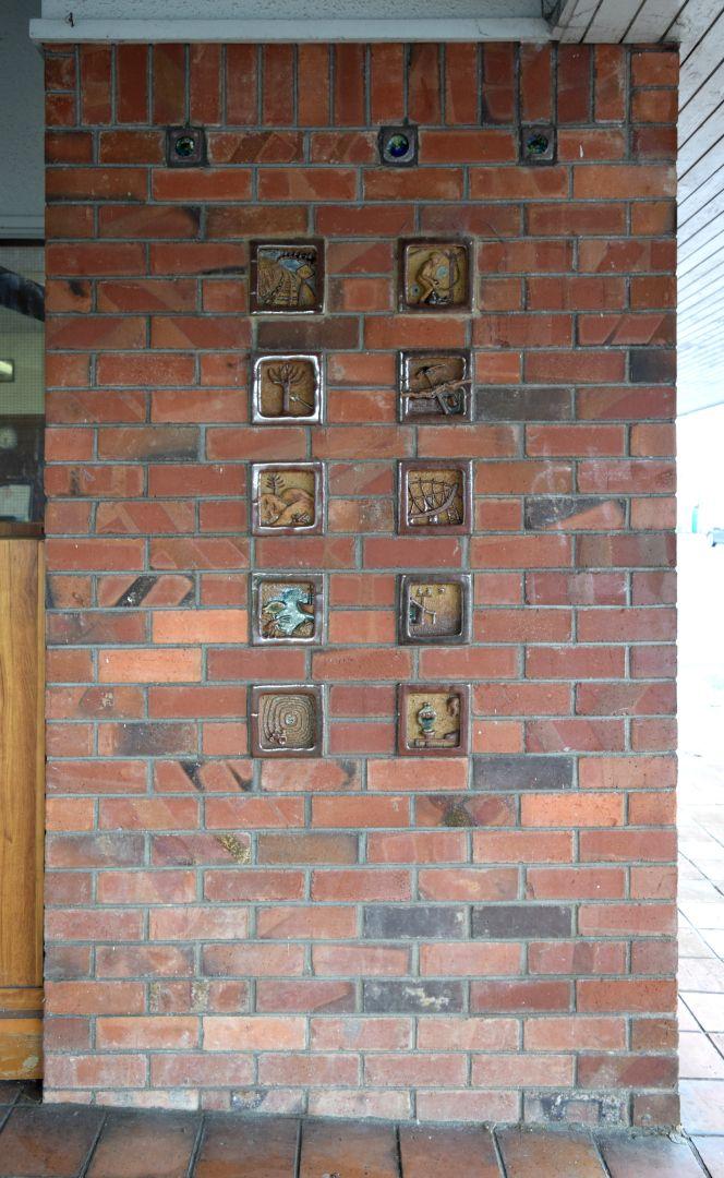 When our local post office was relocated from the historic Council Chambers building to the town centre in 1969, the architect for the new building invited me to make some ceramic tiles to incorporate into the brickwork of the entrance foyer. Taking up the challenge with alacrity, I made 10 glazed stoneware tiles depicting activities within the local district. Then he suggested I make a series of decorative elements to be spaced around the top of the brickwork. Not wanting to take this too literally, I decided to use the opportunity to be more idiosyncratic and produced a series of portraits of local characters.