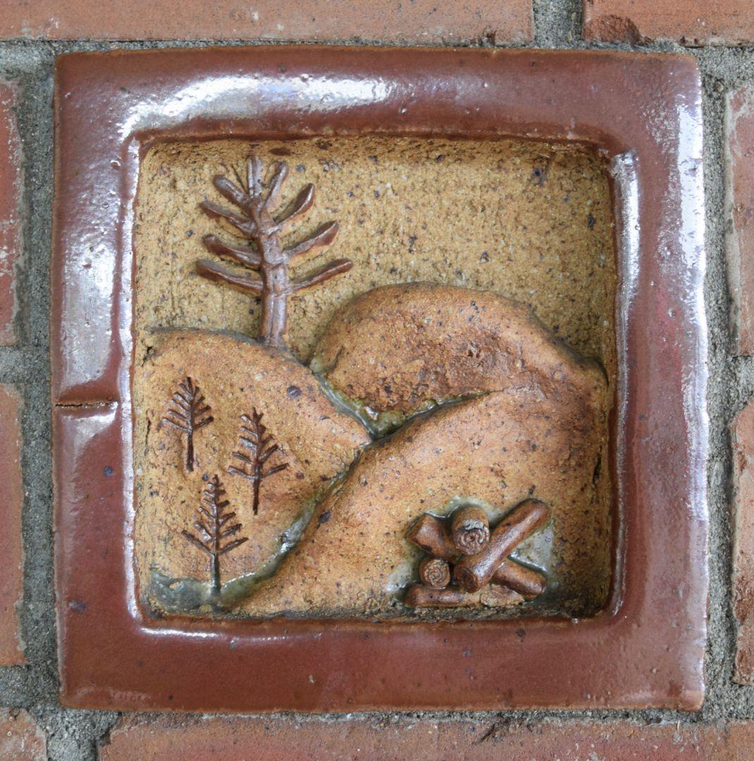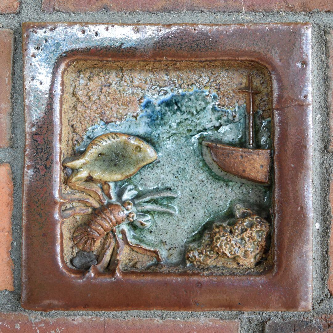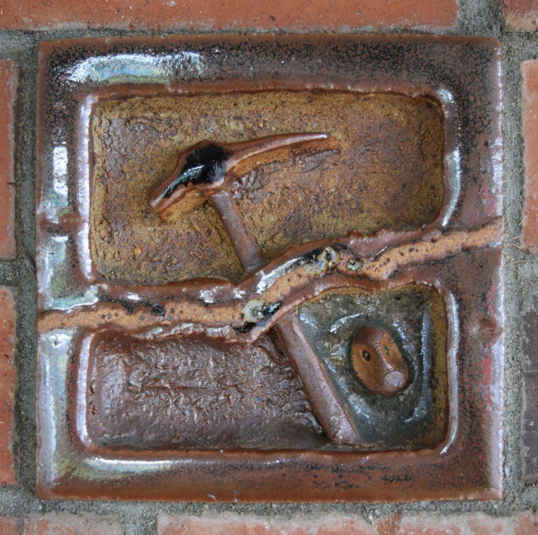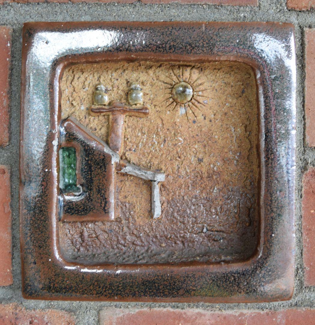When our local post office was relocated from the historic Council Chambers building to the town centre in 1969, the architect for the new building invited me to make some ceramic tiles to incorporate into the brickwork of the entrance foyer. Taking up the challenge with alacrity, I made 10 glazed stoneware tiles depicting activities within the local district. Then he suggested I make a series of decorative elements to be spaced around the top of the brickwork. Not wanting to take this too literally, I decided to use the opportunity to be more idiosyncratic and produced a series of portraits of local characters.