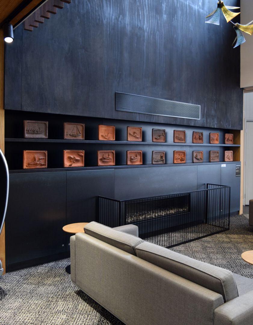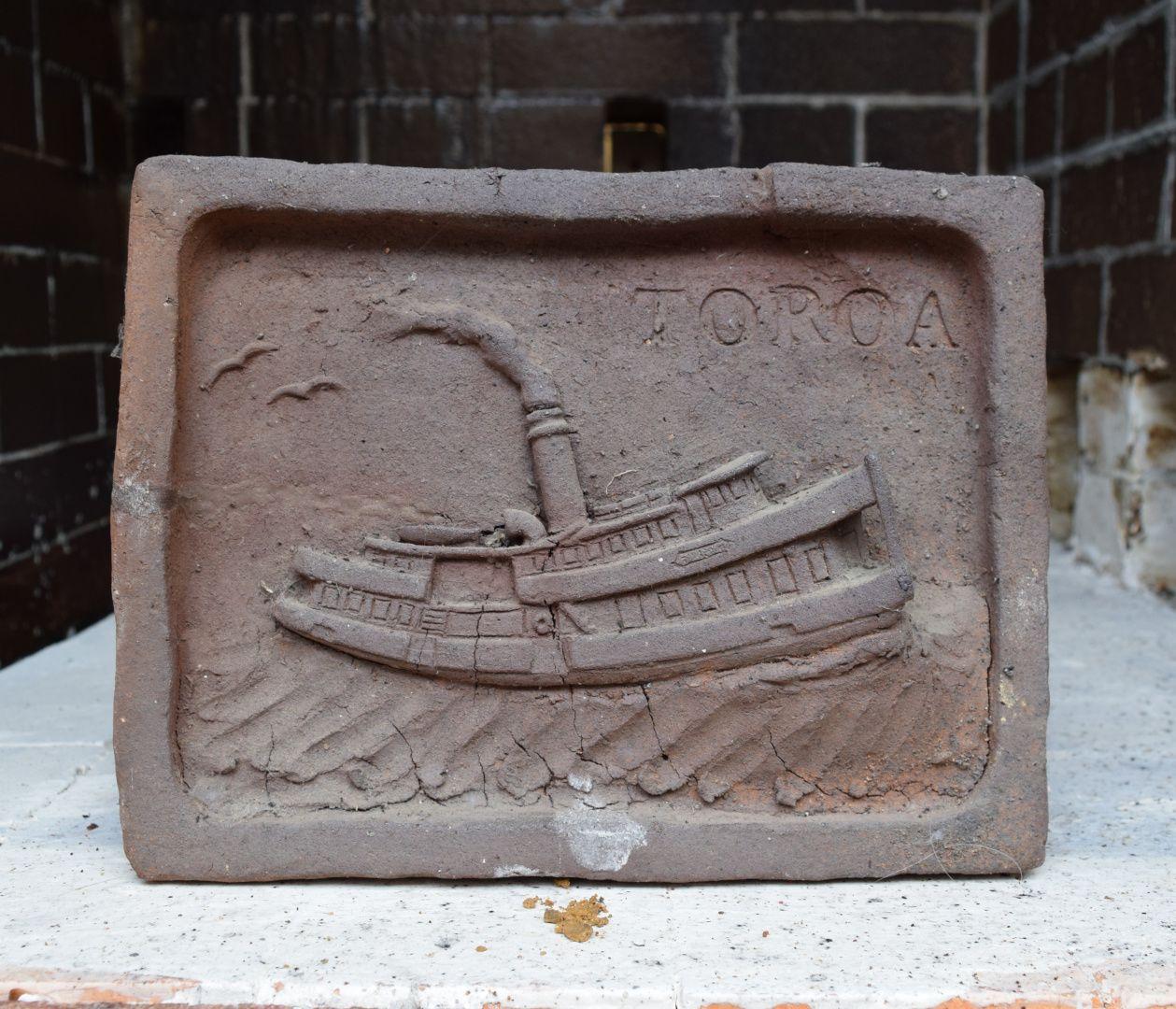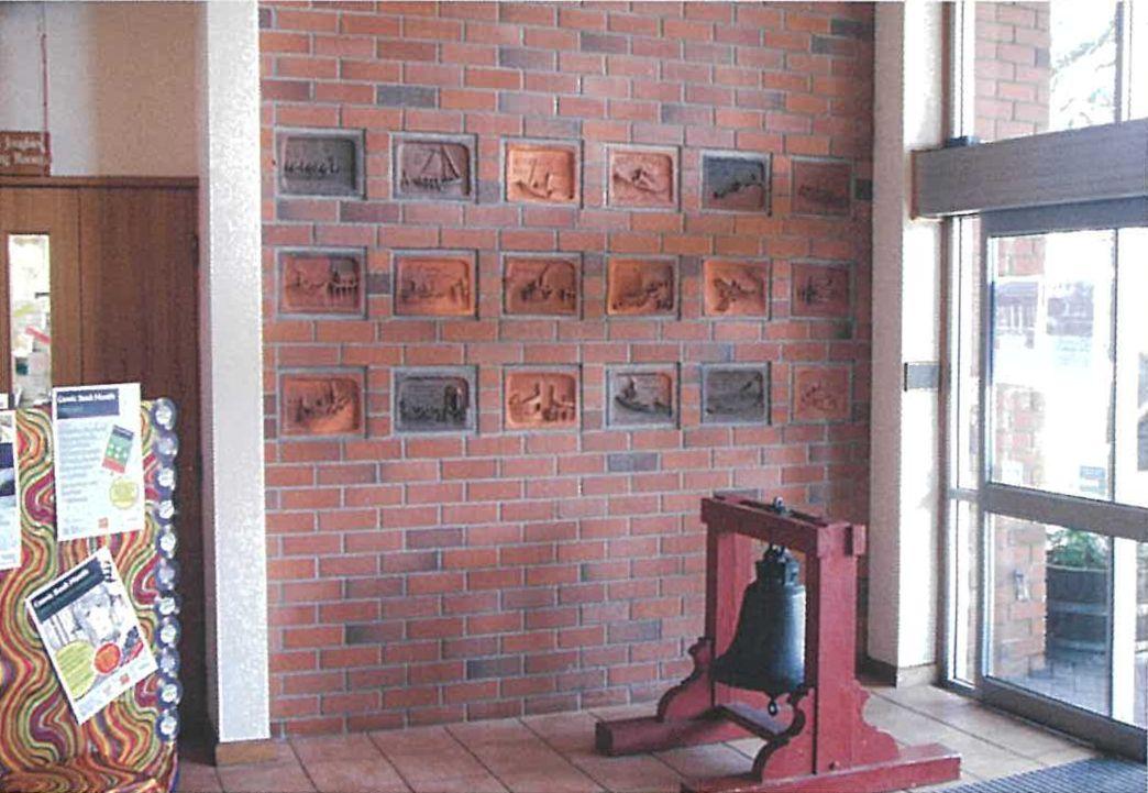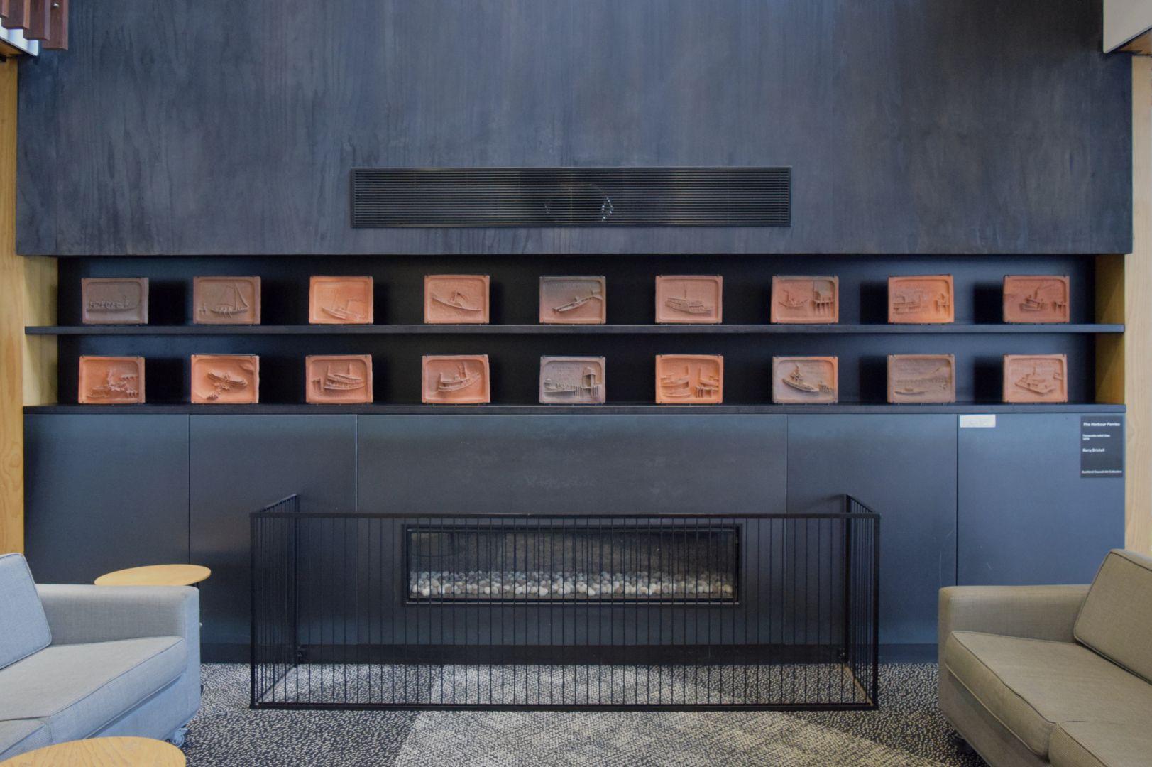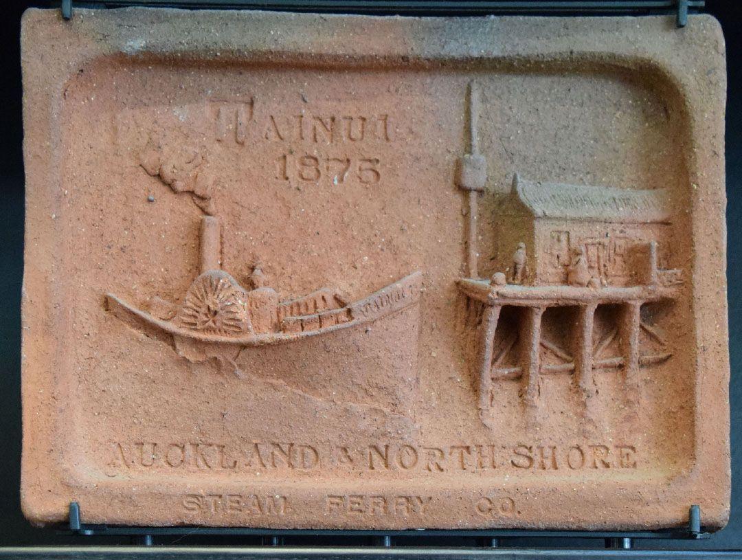 Brickell used images in the book ‘Steam on the Waitemata’ by transport historian W. W. Stewart (A. H. & A. W. Reed, 1972) as inspiration for the tiles, which were wood-fired in his kiln at Driving Creek, Coromandel. Following the delivery of the tiles, they sat loosely on top of book cabinets for a decade until the building was completed. During this time one tile was broken, and three others damaged. The council paid for replacement tiles to be made and Brickell used this opportunity to replace the ‘Toroa’ tile with one of the Kea ferry which had recently arrived in the city. This tile was made for Barry by Paul Lorimer. The Toroa tile is now in the collection of the Driving Creek Railways. Upon completion, the full set were installed in a wall in the library’s entrance foyer.