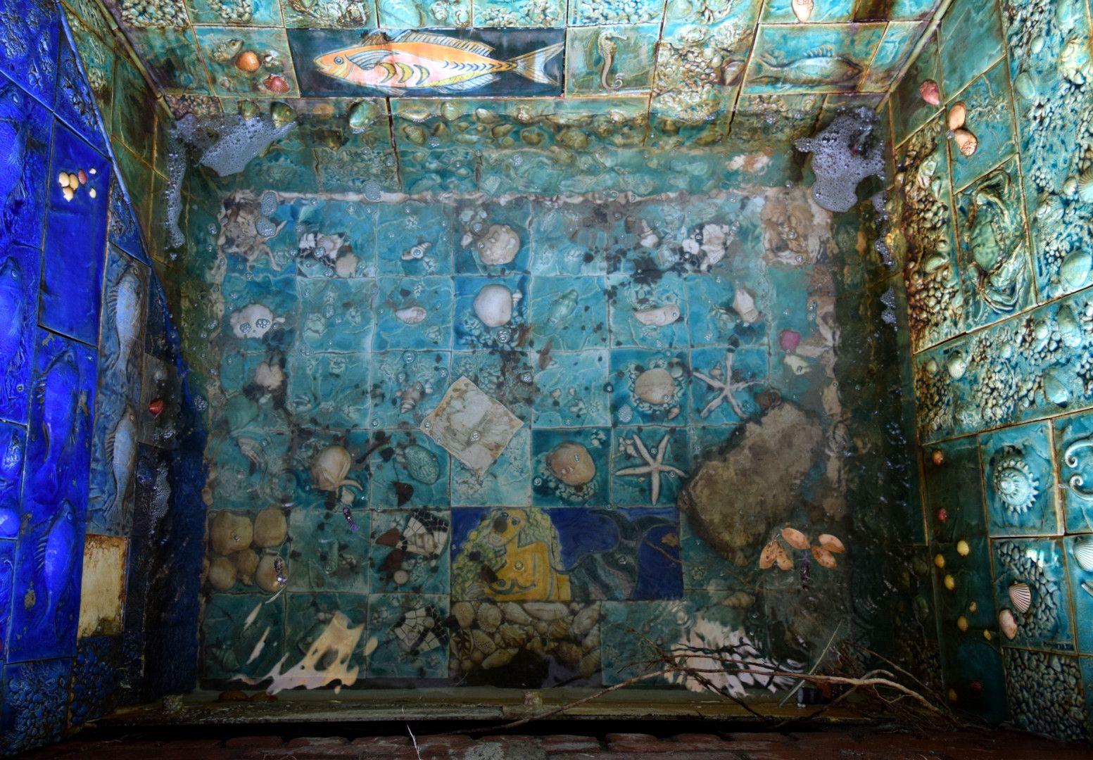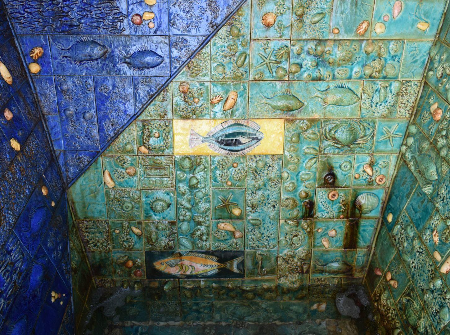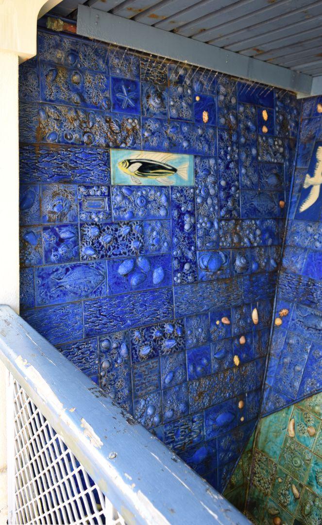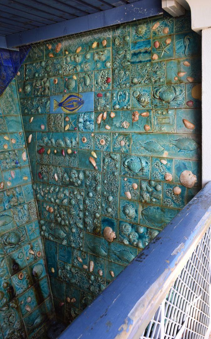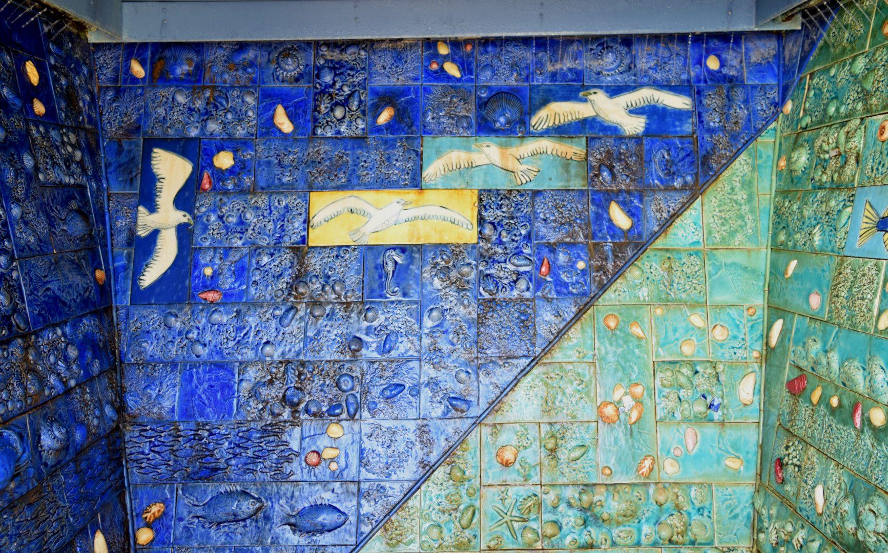 Features tiles depicting fish, crabs, starfish, sea snails, shells of many sorts and seagulls in an overarching palette of blues and sea-greens.