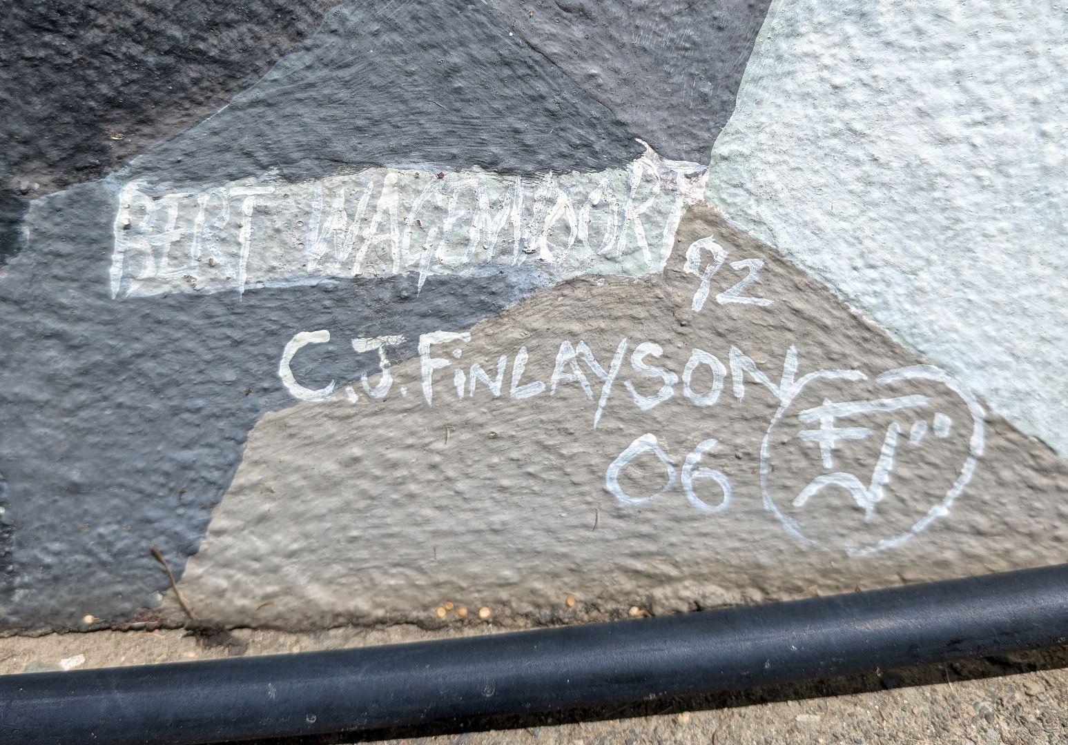 “Bert Wagenvoort was commissioned in 1992 to create this mural which has become a respectable town feature. Renovation of the artwork in 2006 by C.J. Finlayson was made possible by members of the wider community donating funds to the project. Thanks also to - Take Note Takaka; The Brigand, Norton Feasey Assoc; G.B. Surveyors; The Mussel Inn; Community Arts Council; Bob Wells; Trash Palace; Mana Plumbers.”