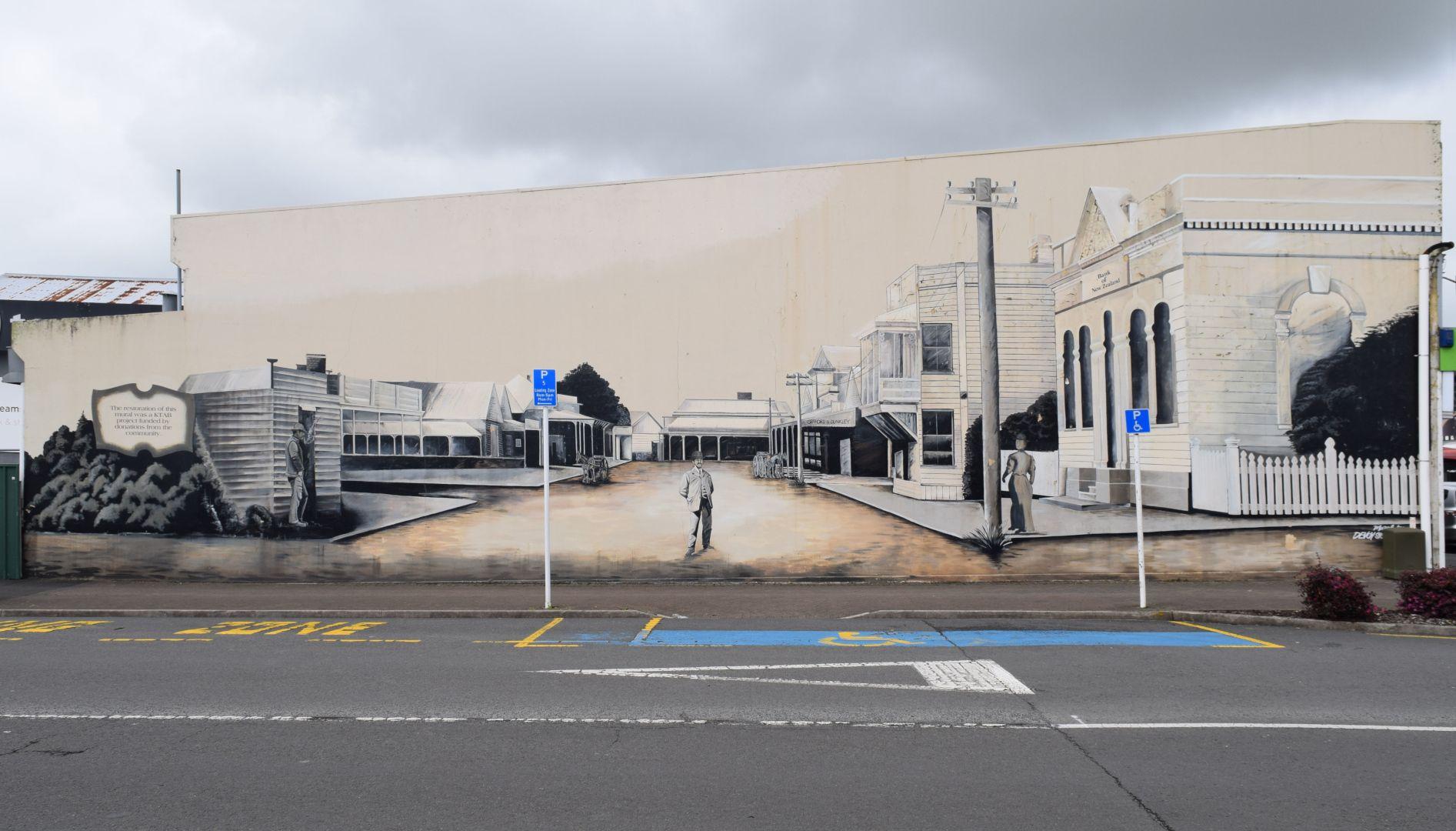 Painted in a nostalgic palette of black, white and sepia, this mural is based on a photograph of Alexander St, Te Awamutu, made by ‘Hawley’ in the early 1900s. The Bank of New Zealand is on the right with the Commercial Hotel behind. A figure, standing front and centre, looks back at the photographer. The original photograph is available online at Te Awamutu Museum.