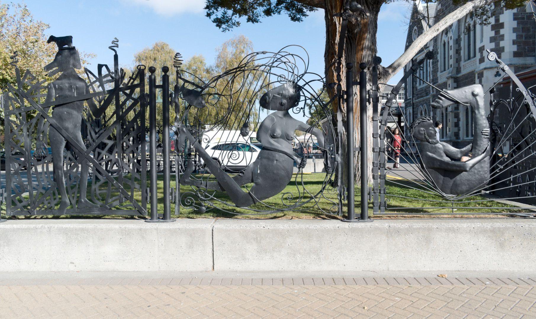 "The Christchurch City Council asked for submissions on the design of a children’s play sculpture as a component of their plans to revamp the Cathedral Square. Bing Dawe approached Noel Gregg about collaborating on the project. Dawe then designed a draft that was accepted by the Council. Dawe’s concept was for seven connected barriers each representing a figure from the Fabulous Races of Greek Mythology. Each figure imitates an attitude in agreement with the barrier theme. There is the man with the face in his chest (over), Antipode, the woman with her feet on back to front (through), woman with large ears (under), Cynocephalus, the man with the head of a dog (out), woman with six arms (around), Sciapod, the man with one large foot (on), and the Trees Sun and Moon (the forbidden garden).