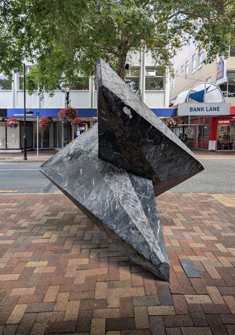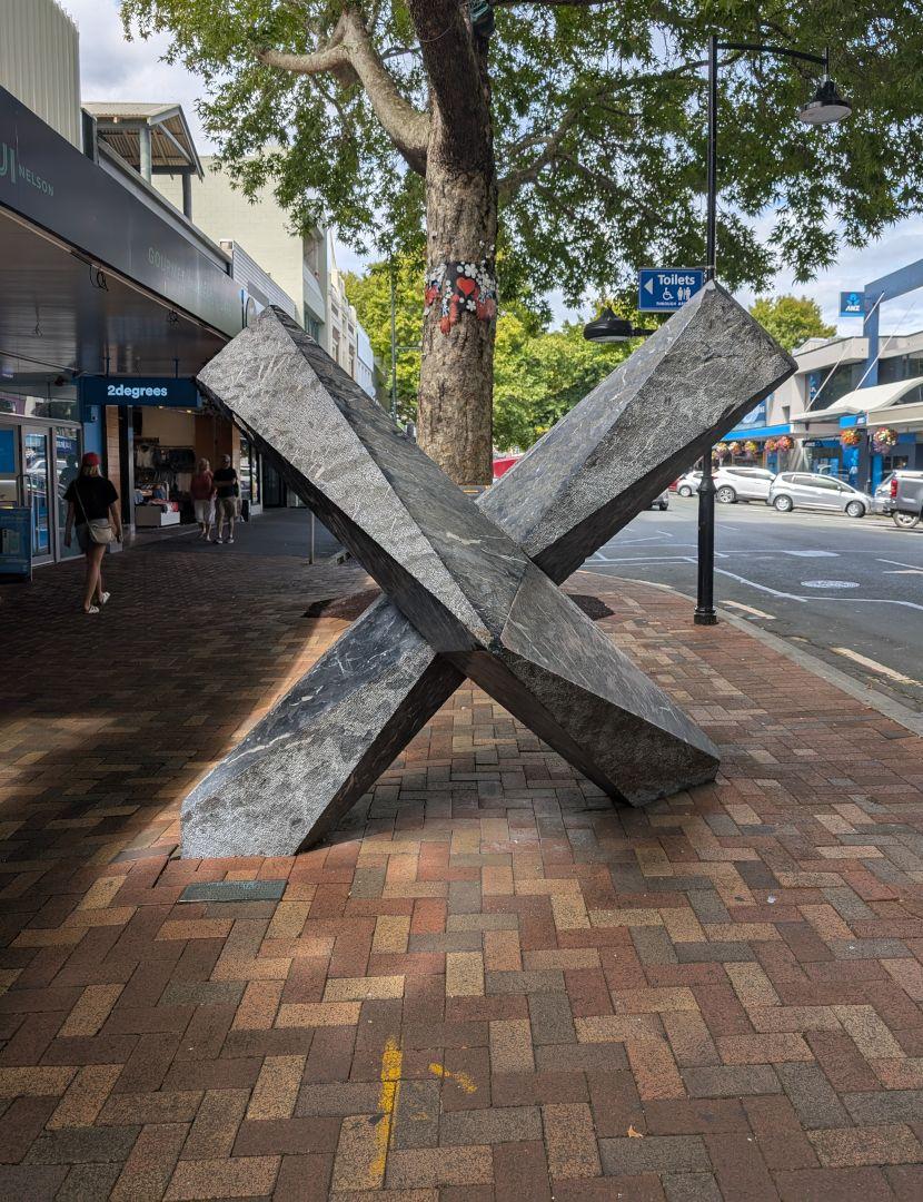 “The Southern Cross Stone sculpture on Trafalgar St in Nelson was created by Takaka Hill sculptor Bruce Mitchell. Based on a crystal formation known as the stone cross the sculpture represents the Southern Cross constellation that guided both Pacific Island and European navigators to New Zealand. The sculpture is made from seven tonnes of black marble sourced by the sculptor from the Golden Bay area and is arranged to match the North/South, East/West points of a compass.”