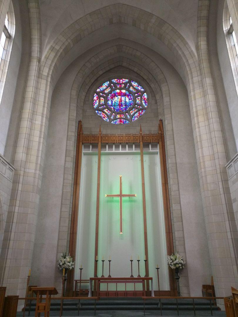 “A generous anonymous gift in memory of the pioneers of our land, over 5m in diameter. The glass was designed and made by Carl Edwards, one of Britain’s finest stained glass artists. The design is a symbolic representation of the Holy Trinity under which name the Cathedral is dedicated. The main element of the design consists of an eye, in the top segment, the medieval symbol of God the Father; a ruby cross running right through, as symbol of God the Son; and a dove in the centre, symbolising God the Holy Spirit. The reinforced stone-effect sections of the window frame ware held together by heavy stainless-steel dowels, thus avoiding the possibility of rust. As the artist predicted, the window glows like a jewel across the city at night.”