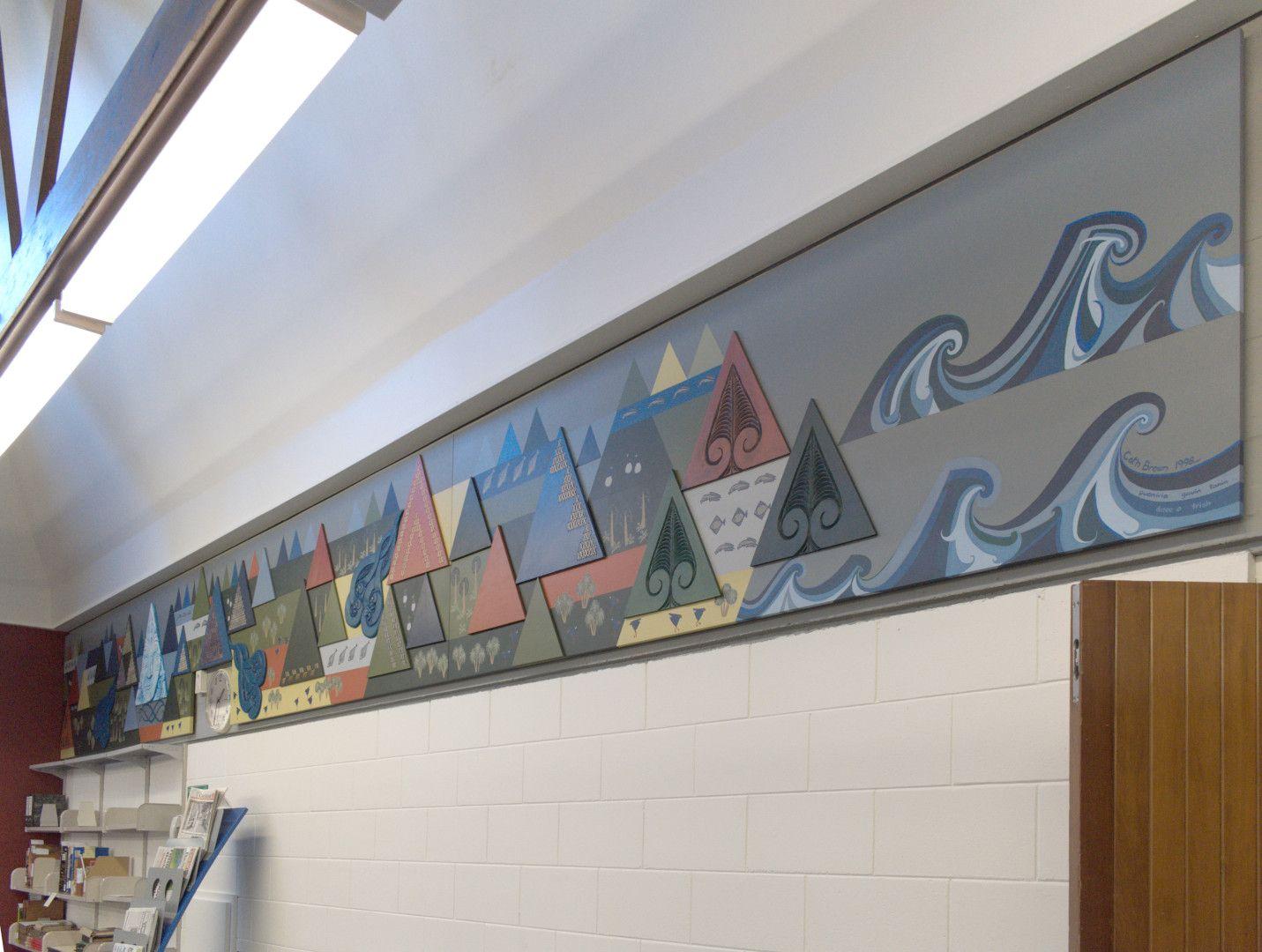 The mural's colours are earthy - blues, greys, browns and reds. These are the colours Cath saw from her home when looking towards the hills and when she drives to Te Tai Poutini - The West Coast. The colours are also influenced by the existing tones of the Library's walls and carpet.