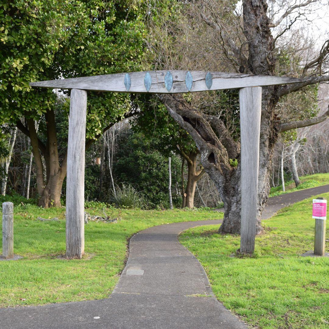The work is a simple, trabeated arch over the path leading into the park from Rose Road. Fabricated in wood (Eucalypt and Jarrah) and copper sheeting. Inspired by the sea, the artist collects many of her materials, such as stones and weathered timber, from the beach and demolition sites.