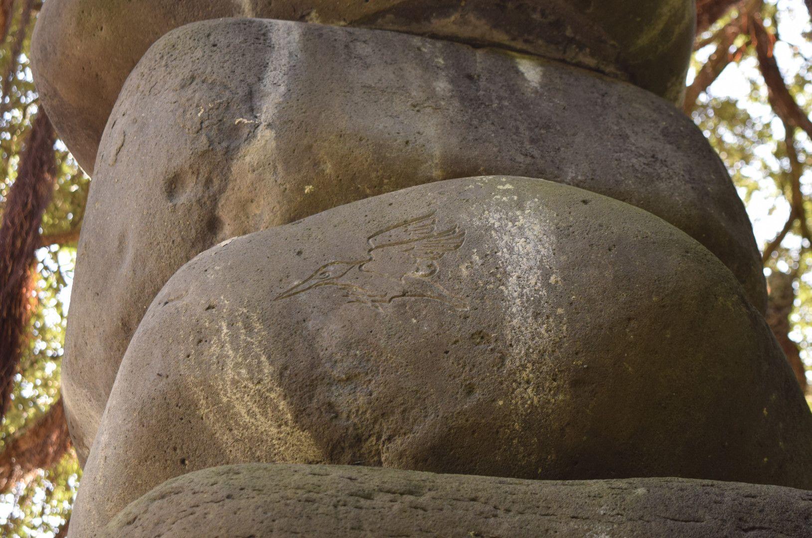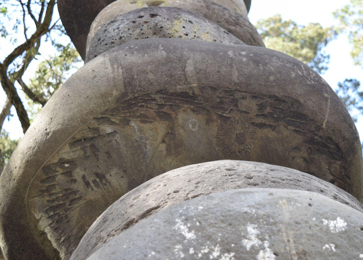 Following a year of careful consideration, the elders of Ngāti Kura and Ngāti Rēhia hapū, representatives of the Department of Conservation and the local landowners approved a particular selection of boulders for the sculpture. Ngāti Kura elders lifted the tapu from the stones and donated them for the project as a gift to Auckland City. Because of the threat of seismic movements, structural engineers required the 18m columns to be basalt boulders on the lower half with a lighter material above. Aluminium is a very common mineral in the earth and could be made to complement the boulders. With many setbacks, the work took two years to complete all the components, but only two weeks to assemble on the site.