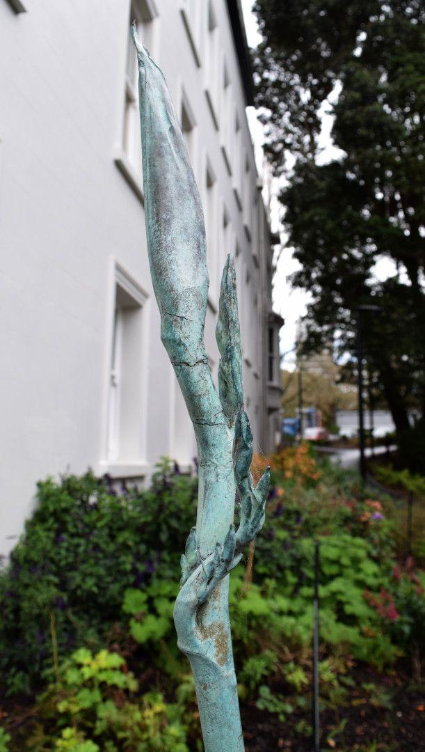 Based on native plants, fern, palm and flowering flax, they are sited in ... a small [garden] plot which is formally planted to resemble an eighteenth century European garden. 'Armlet' comes from a series of the artist’s works which are titled to make reference to the adornments of classical antiquity – amulet, necklet, coronet, diadem. Two of the sets of three stems – 'Spray' and 'Corsage' – were also titled for the European tradition of women wearing flowers for special occasions. The three stems that make up 'Armlet' are meant to stand as sentinels in attendance upon Mother Nature, and to draw attention to her beauty through their own....