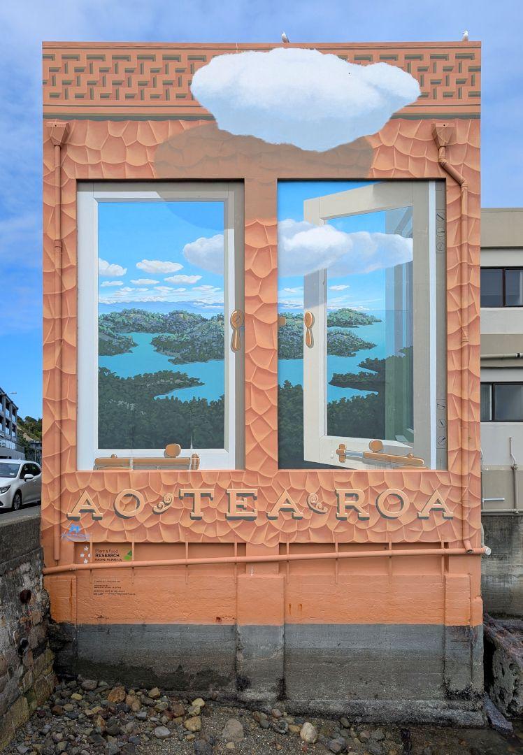 This mural combines an arrangement of windows, cloud, hand carving and familiar scenery to bring qualities of mythology, human creativity and natural phenomena into the present. The motif along the top is derived from a “Stairway to Heaven” pattern, inspired by the carved ornamental panels found in whare whakairo (meeting house) on marae throughout New Zealand.