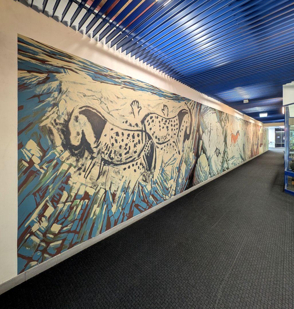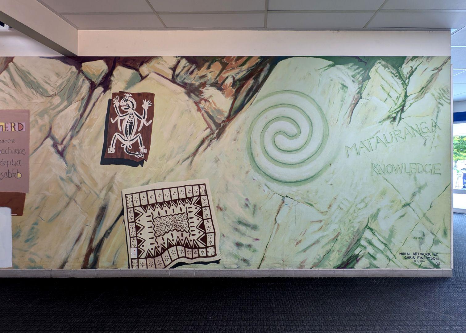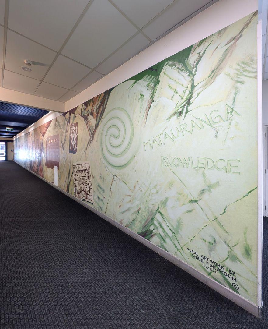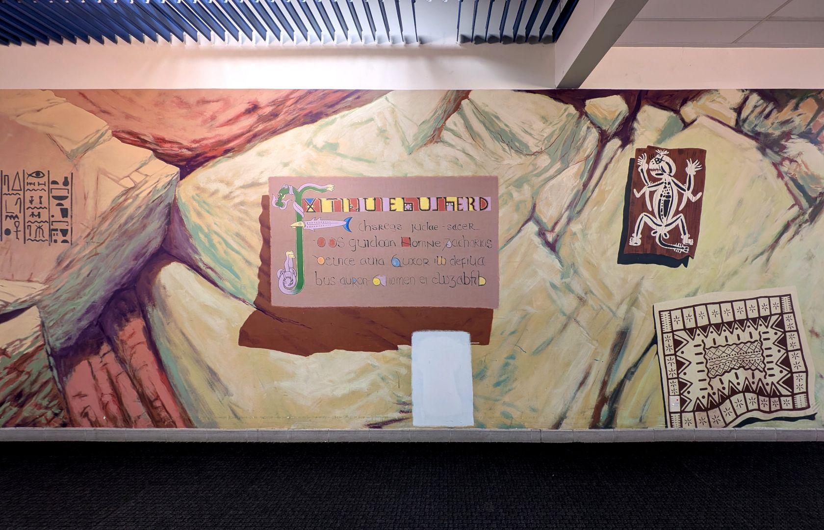 This site-specific mural, commissioned for the opening of the then-new Elma Turner Library, depicts a variety of ways that knowledge has been recorded and communicated across the ages. A range of cultures and epochs are featured including Palaeolithic rock art (2500 BC); Egyptian Hieroglyphics (1350 BC); Celtic verse (800AD); and Aboriginal, Pacific and Māori art forms.
