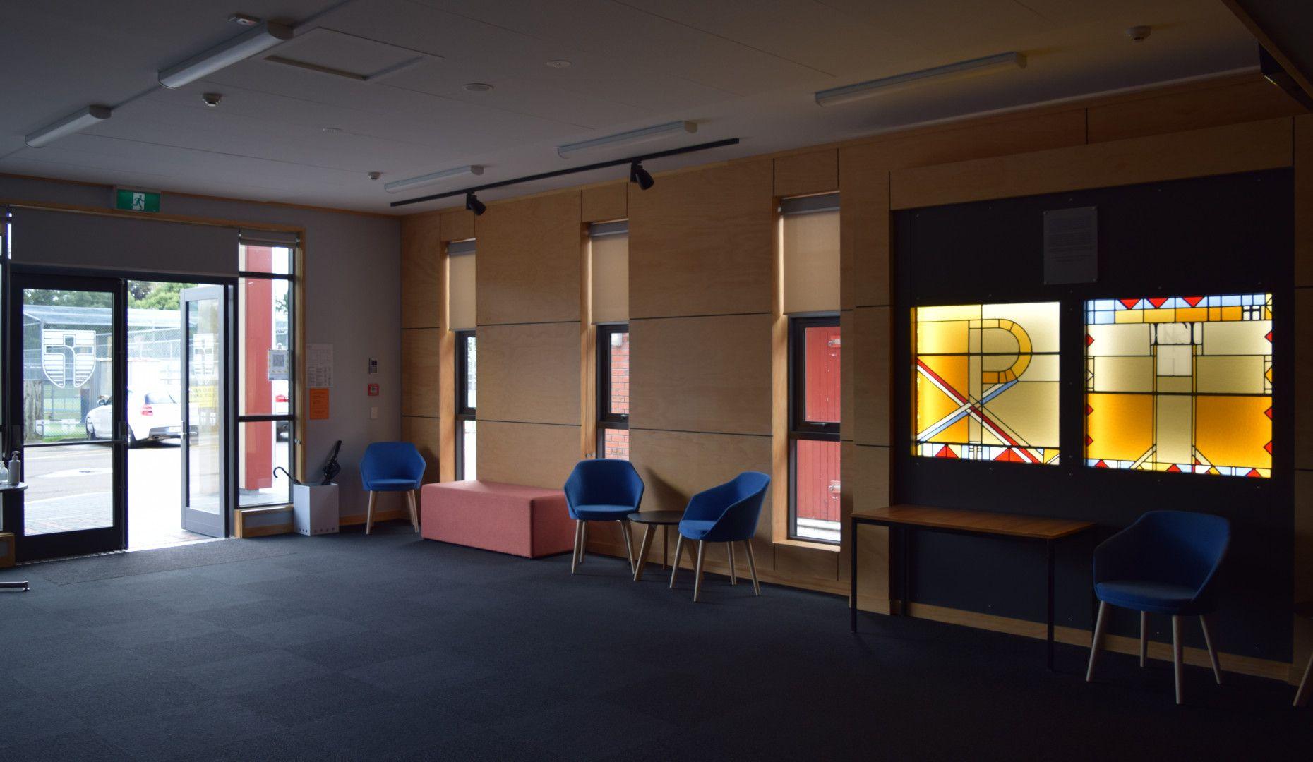 John Paul College was founded in 1987 with the amalgamation of Edmund Rice College and MacKillop College. The work was moved to the newly built Thurston Performing Arts Centre in 2020. When re-sited glass was installed in front of the windows for protection. Some paint is missing, but existing paint was rejuvenated during the moved. Now the windows are back lit by dimmer lights.