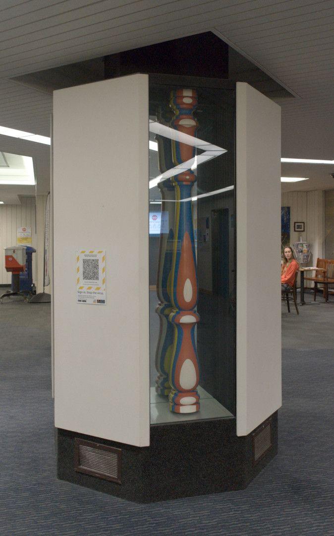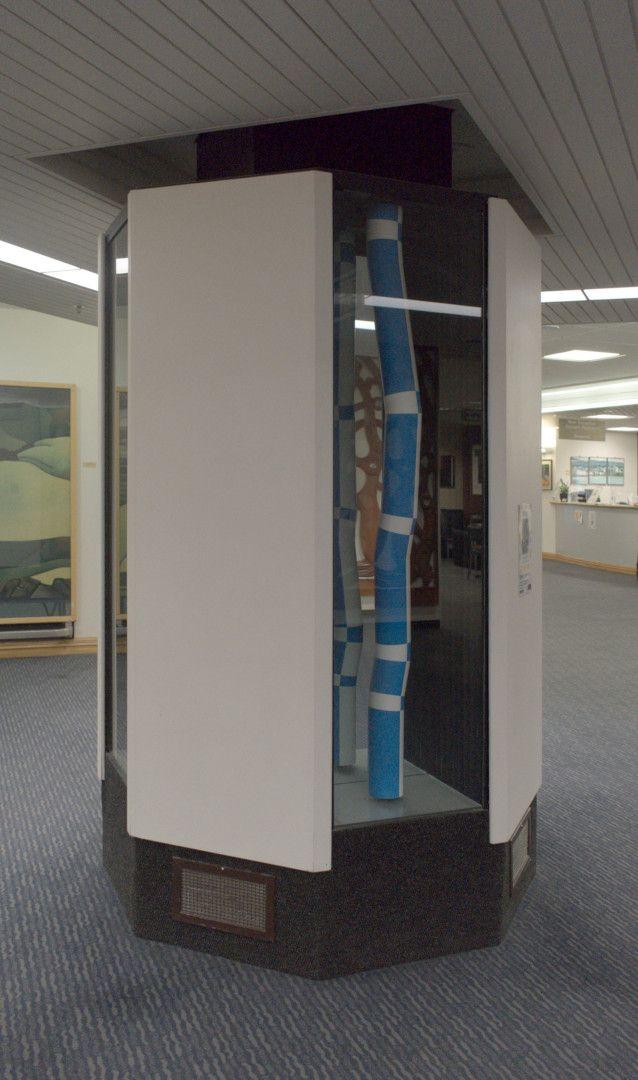 Four rotating vertical forms each contained within their own vitrine space. False depth is created by mirrors (the "infinity effect") on the vitrine interior. The rotating forms are only partially visible due to the shape of the pillar around which the sculpture is built.