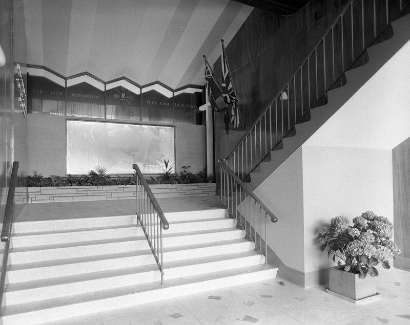 In the early 1950s the town of New Plymouth decided to use this opportunity to build a war memorial hall and library — replacing the existing ones — and add a regional museum. The local firm Taylor & Syme & Associates (later operating as Taylor & Collins) won the job of designing the building.