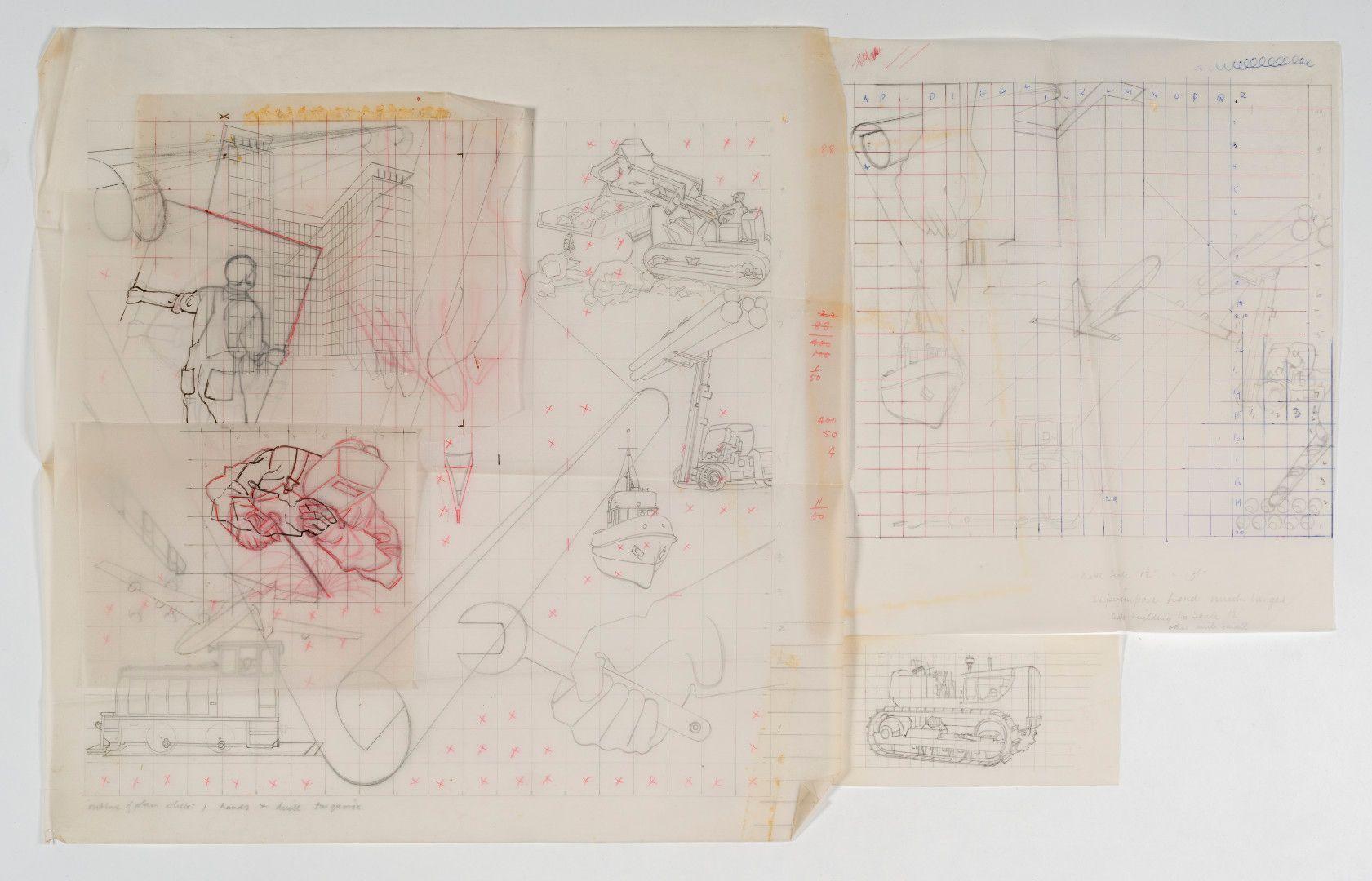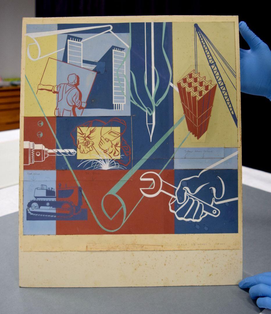 Now missing, E. Mervyn Taylor’s final mural was created for Cable Price Downer House, Wellington, in 1964. Taylor may have never seen the completed mural, as he passed away suddenly in June before the opening of the building in July of 1964. Aesthetically, it seems to sit at the very cusp of what might have been a new era in Taylor’s oeuvre. Constructivist and pop art influences are apparent, possibly inspired by Taylor’s visits to both New York and Moscow in 1958. In a curious bookend to his public art practice, Taylor ended up working with the same architect for both his first and final murals: Bruce Orchiston, who had also commissioned Taylor to create the windows for the Ōtaki War Memorial Hall in 1955.