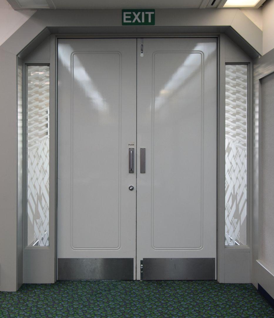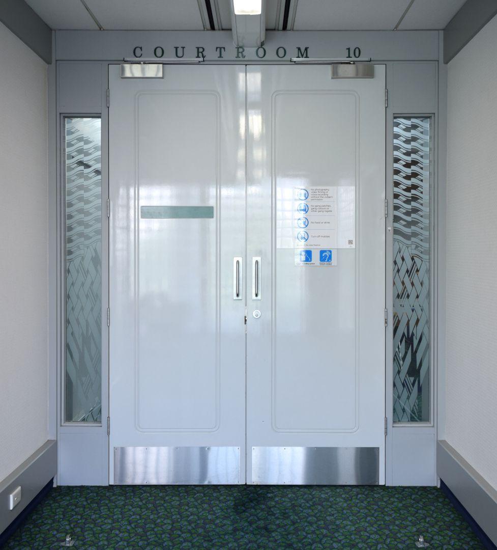 Eli Christiansen, ‘Sandblasted Panels’, Entrances to Courtrooms 8, 9, 10 and exit [showing exit], High Court, Te Whanganui-a-Tara Wellington. Images: Bronwyn Holloway-Smith, Public Art Heritage Aotearoa New Zealand, 2024