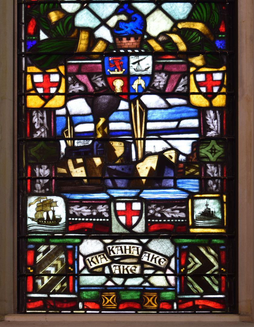 The window lists and depicts various sites where the war was fought (Palestine, France, Acre, Gallipoli, Greece, Egypt, Germany, Samoa, Sinai, Belgium) and includes references to the Crusades. It also includes the New Zealand Coat of Arms (inscribed ‘Onward’), and depictions of the various armed forces. It includes Māori motifs and the phrase ‘Kia Kaha Ake Ake’ (stay strong forever) alongside the latin ‘Pro Patria Mortui Sunt’ (for your country is dead).