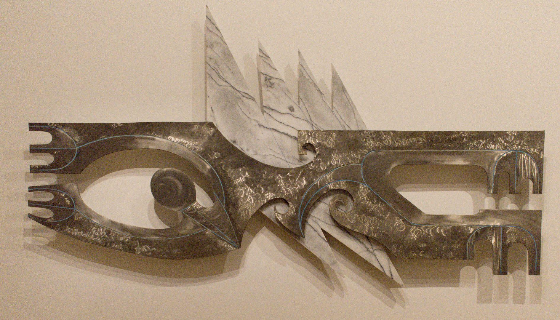 The work contrasts curved and figurative shapes cut in metal and inset dark areas of stone with boldly veined marble cut in sharp geometric shapes.