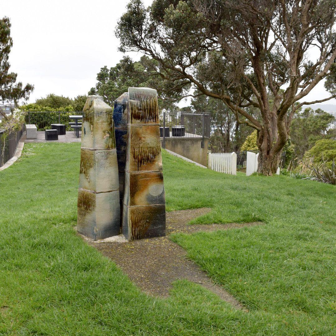 "This sculpture was a commission by the university in 1979 and was originally sited in the courtyard outside the Rankine Brown Library. Preceding the redevelopment of this space into the Hub and Tim Beaglehole Courtyard, the sculpture was shifted in 2011 to its current spot on the grassy knoll overlooking the harbour at the corner of the library building and student union buildings."