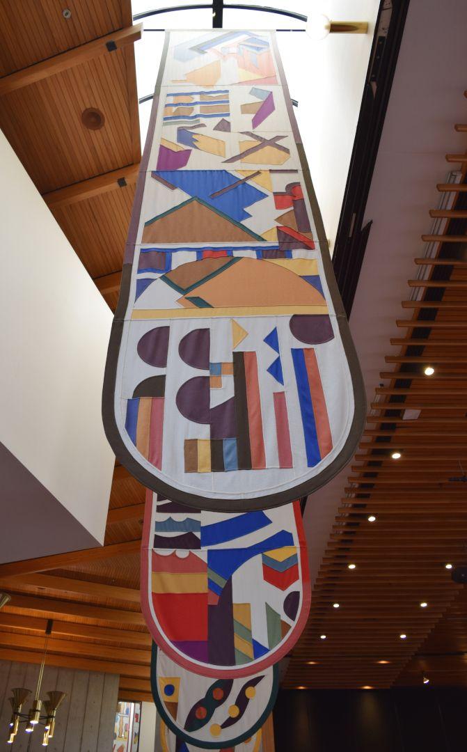 These banners were designed by Gordon Crook and made by Nancy Seaton and others in the early 1980s, along with a set of wall hangings that remain installed in the venue.