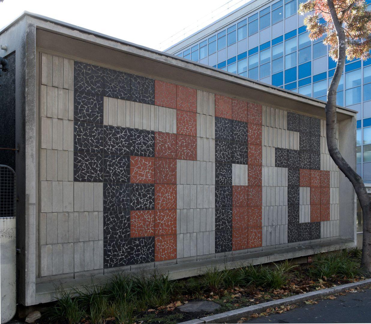 The two murals (one at each end of the building) consist of a geometric pattern of interlocking forms in burnt sienna and black tiles. One shows three forms, the other a larger single pattern. The tiles have a crazed pattern picked out in white.