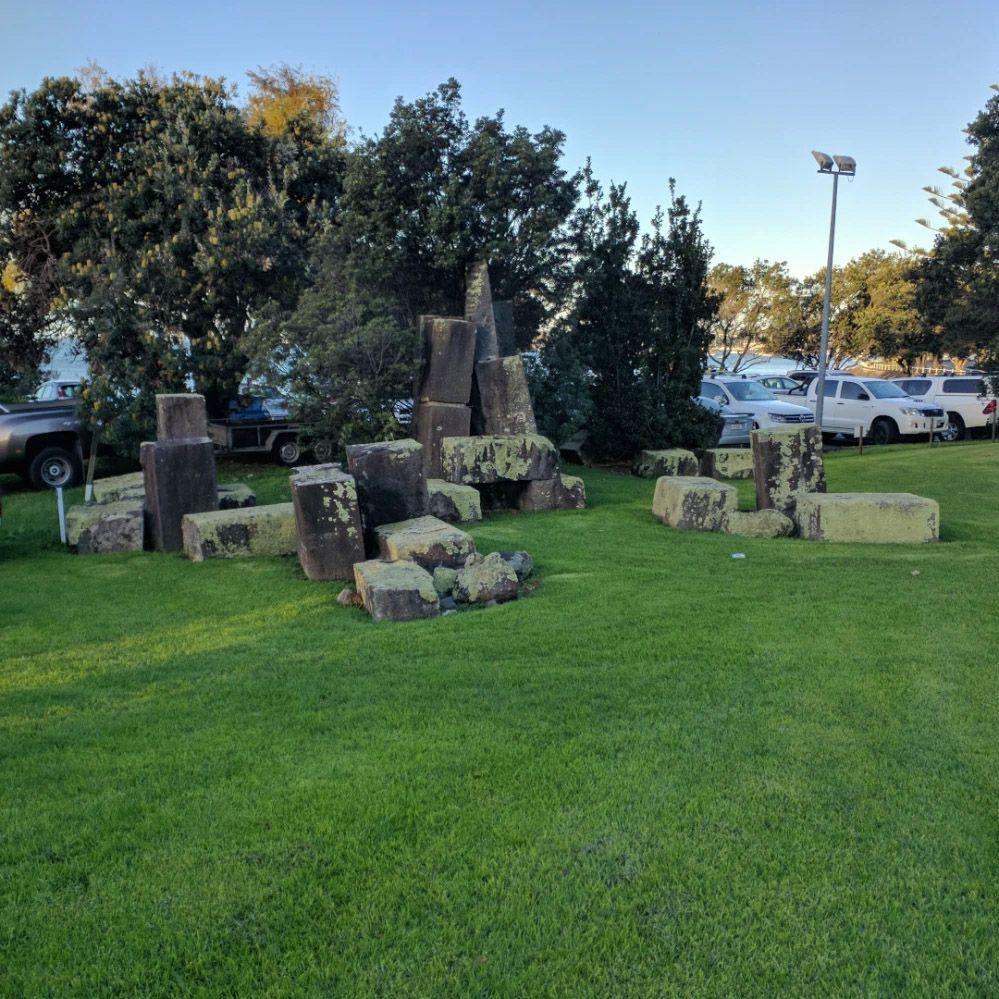 Referred to by Ngan as a “stone sculpture garden”, the assembly of the blocks was overseen by Harbour Board design engineer Mr Colin Pask who worked from a model provided by Ngan. The basalt rock sculpture is made from stone that was once part of the old Graving Dock that stood at the bottom of Albert and Hobson Sts.