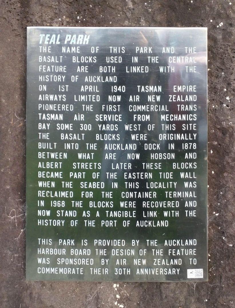This park is provided by the Auckland Harbour Board the design of the feature was sponsored by Air New Zealand to commemorate their 30th Anniversary"