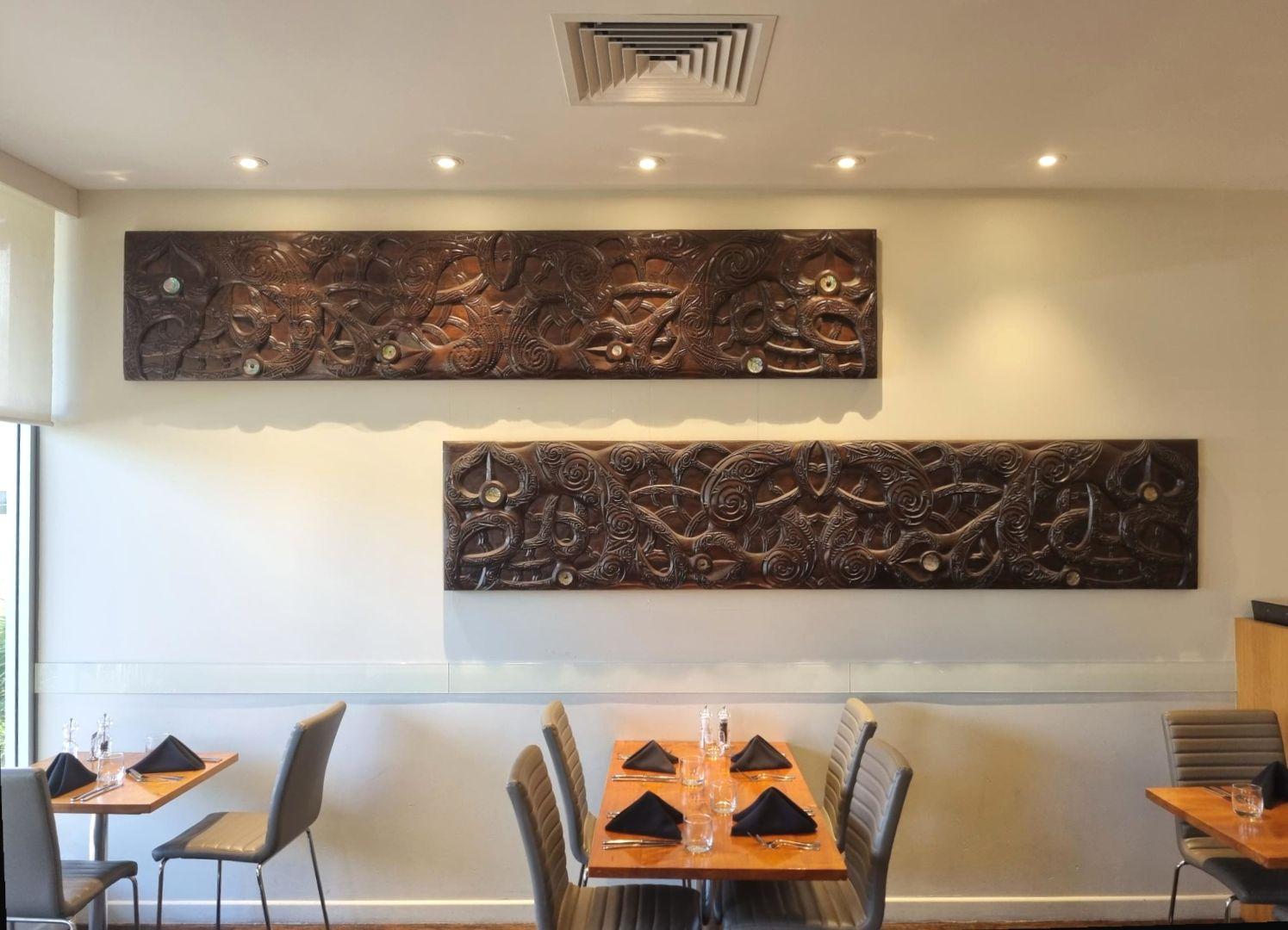 Hōne Taiapa (Ngāti Porou), title unknown (n.d.) [2 horizontal panels, shown in lobby], Rydges Rotorua, Whakarewarewa, Rotorua