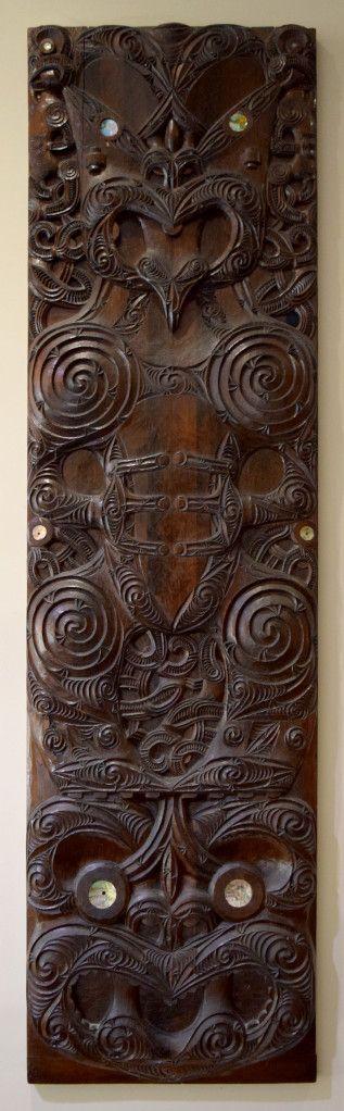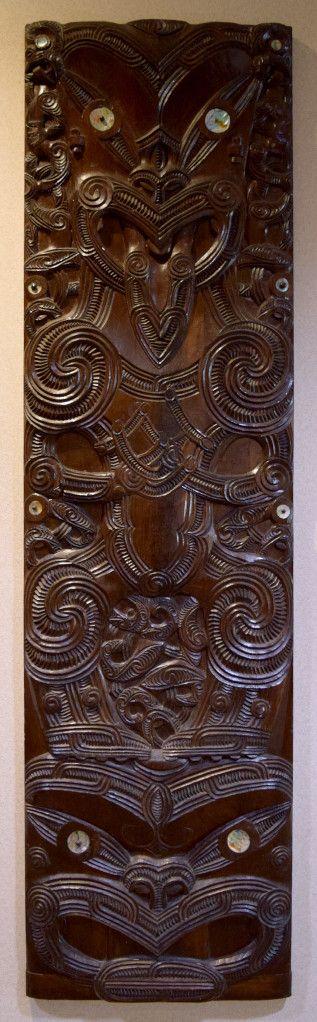 These 7 vertical whakairo panels lining the hallway are considered distinct from the further 2 horizontal panels now located in the restaurant (formerly behind the main reception desk).