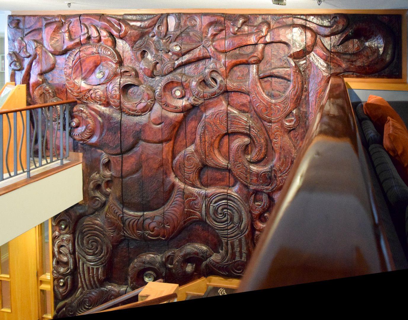 A plaque installed with the work reads: "This mural depicts a traditional legend of how the Gods were created and shows Tānemahuta (Trees and Birds) attempting to push his father Ranginui (Great Sky) and his mother Papatūāanuku (Earth) apart. Initially, his attempt failed until Tānemahuta inverted his position and pushed him up with his feet."