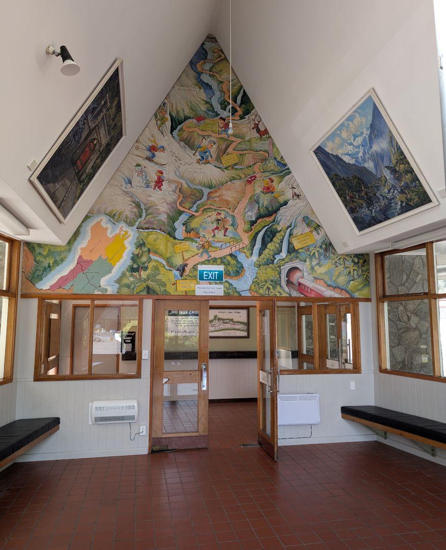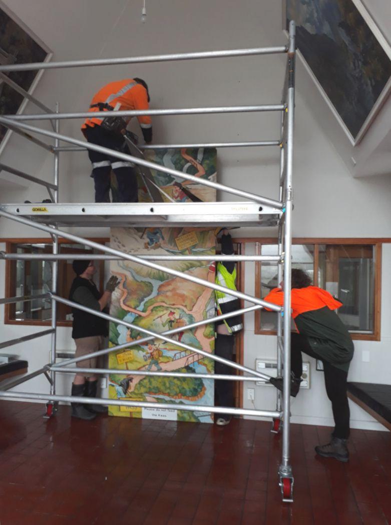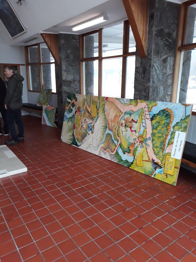 In February 2016 the Governor General was scheduled to visit Arthur’s Pass, providing impetus for Kiwirail to reinstate the artworks to the waiting room. The three paintings were reinstalled, however the mural was not.
