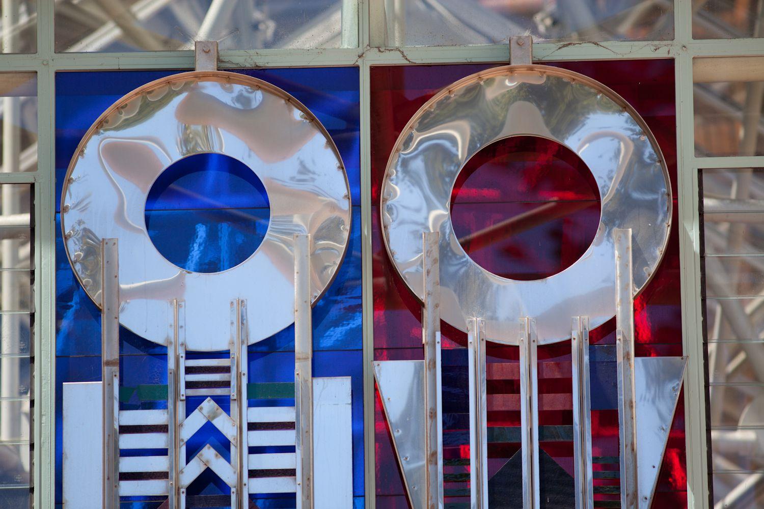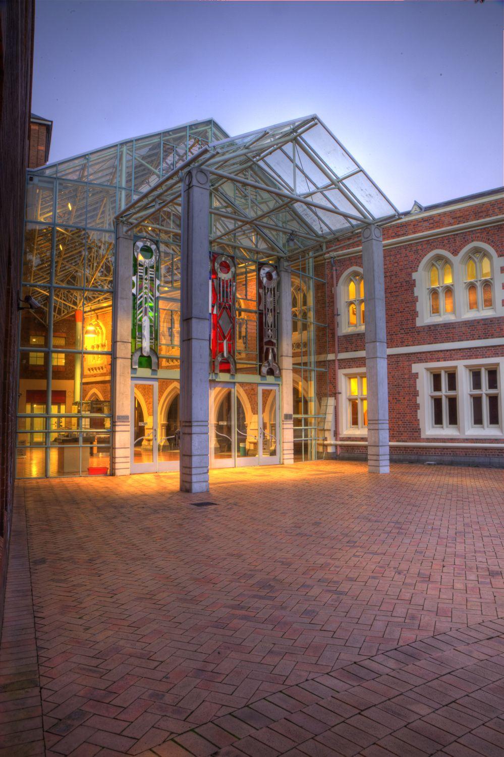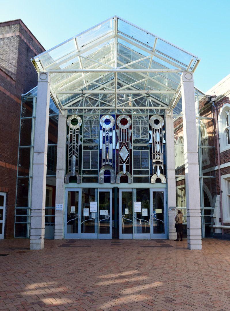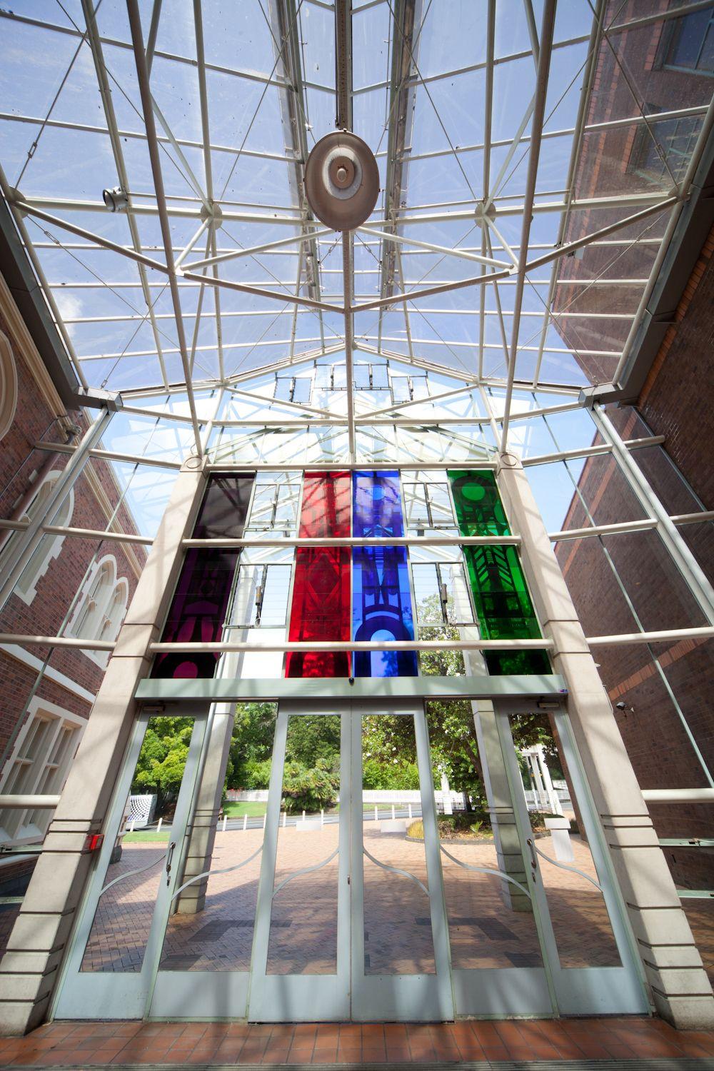 Jacob Scott's sculpture welcomes visitors to the High Court. Each coloured glass panel expresses cultural significance through modern shapes that invoke traditional whakairo forms.