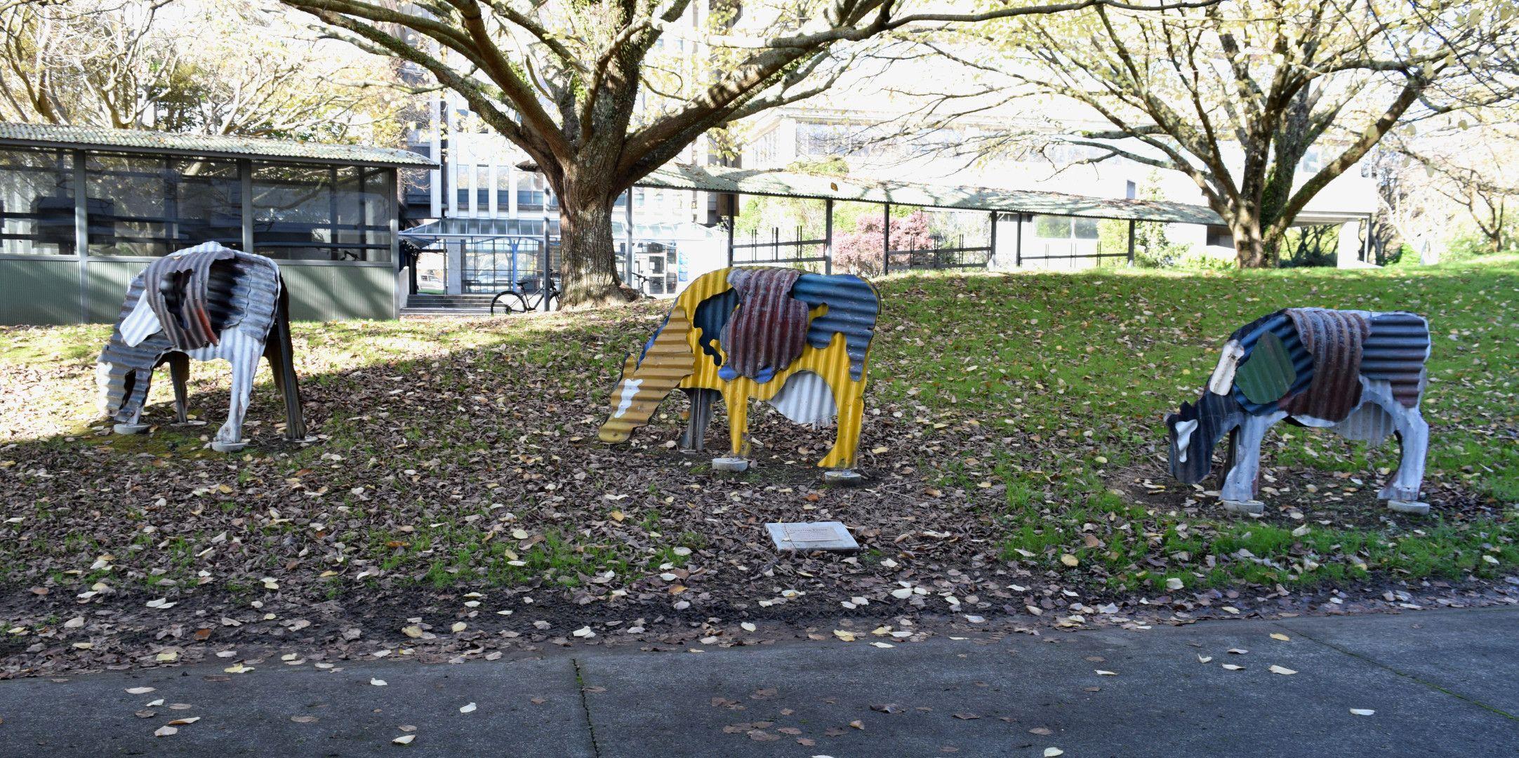 An apt subject for an agricultural university, this work is a sculptural composition of three painted, corrugated iron cows. Thomson created the work while Guest Artist in Residence at Massey University.