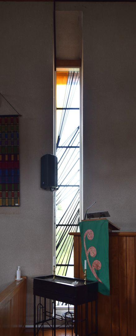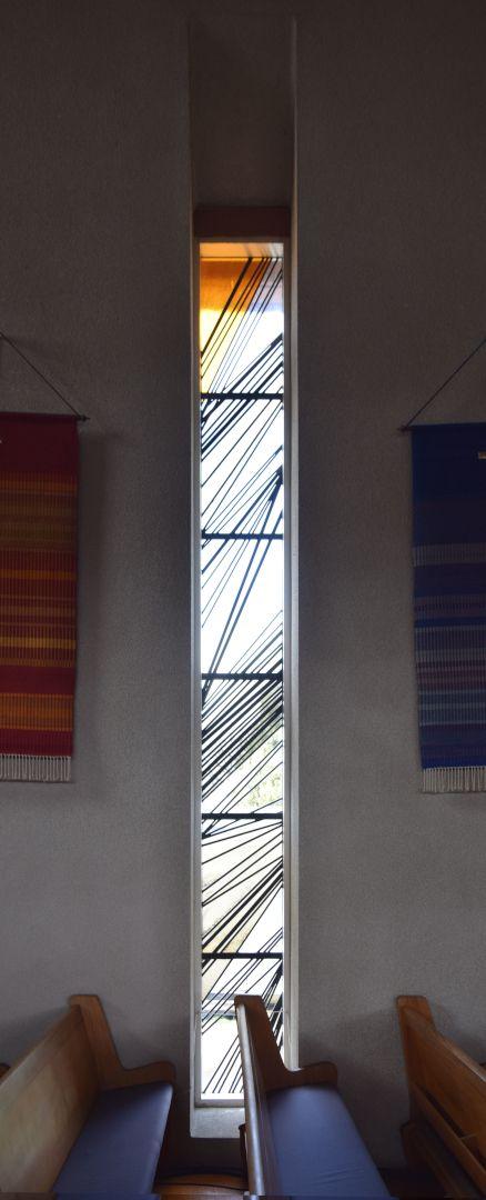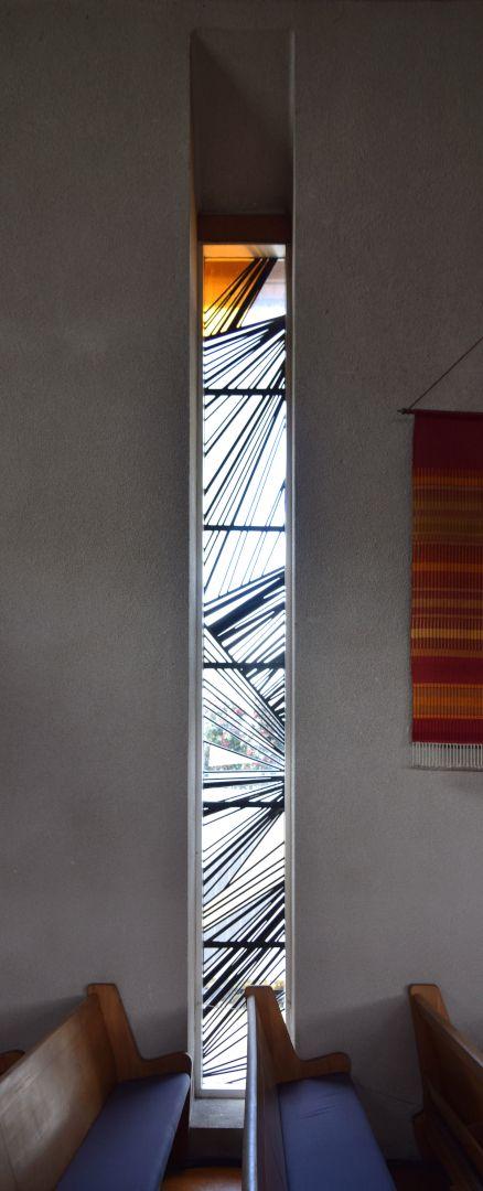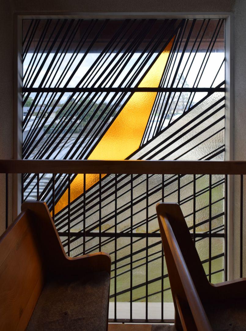 For the windows in the body of the church he “used cathedral glass in muted colours” but with striking use of dynamic “leading” lines.