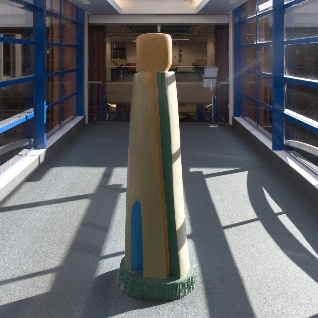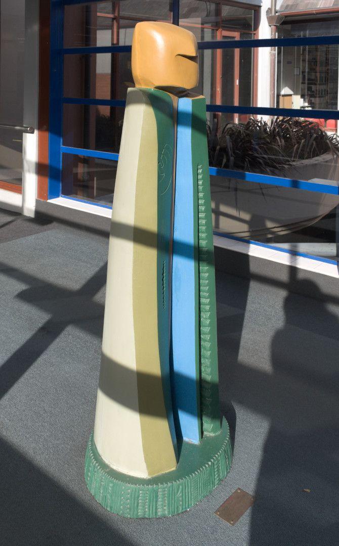 This site specific work was created as the guardian of the library. Carved from tōtara and painted in bold acrylic colours, 'Kaitiaki' is securely grounded to the floor facing the main entrance doors.