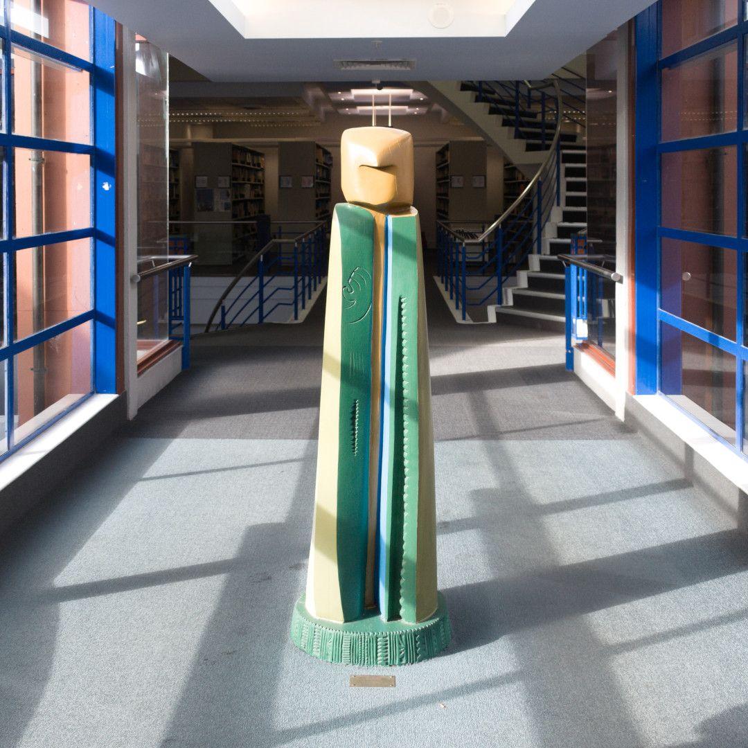 "In Māori culture, a Kaitiaki image is a guardian, responsible for watching over and protecting the people and treasures of a place. This contemporary Kaitiaki, carved in totara, is sited to oversee the treasures of our University Library and observe those who enter. While safeguarding those seeking knowledge and encouraging the process of learning it also heralds that this is a place which needs to be treated with care and respect. The cloak form adds to the figure’s presence as a symbol of the wearer’s power, identity, and restrained energy."