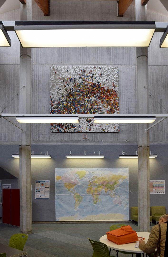 The work, installed in the (former) Architecture & Planning School Library, has always been mounted well above head height, giving little opportunity for an unobstructed, complete view.