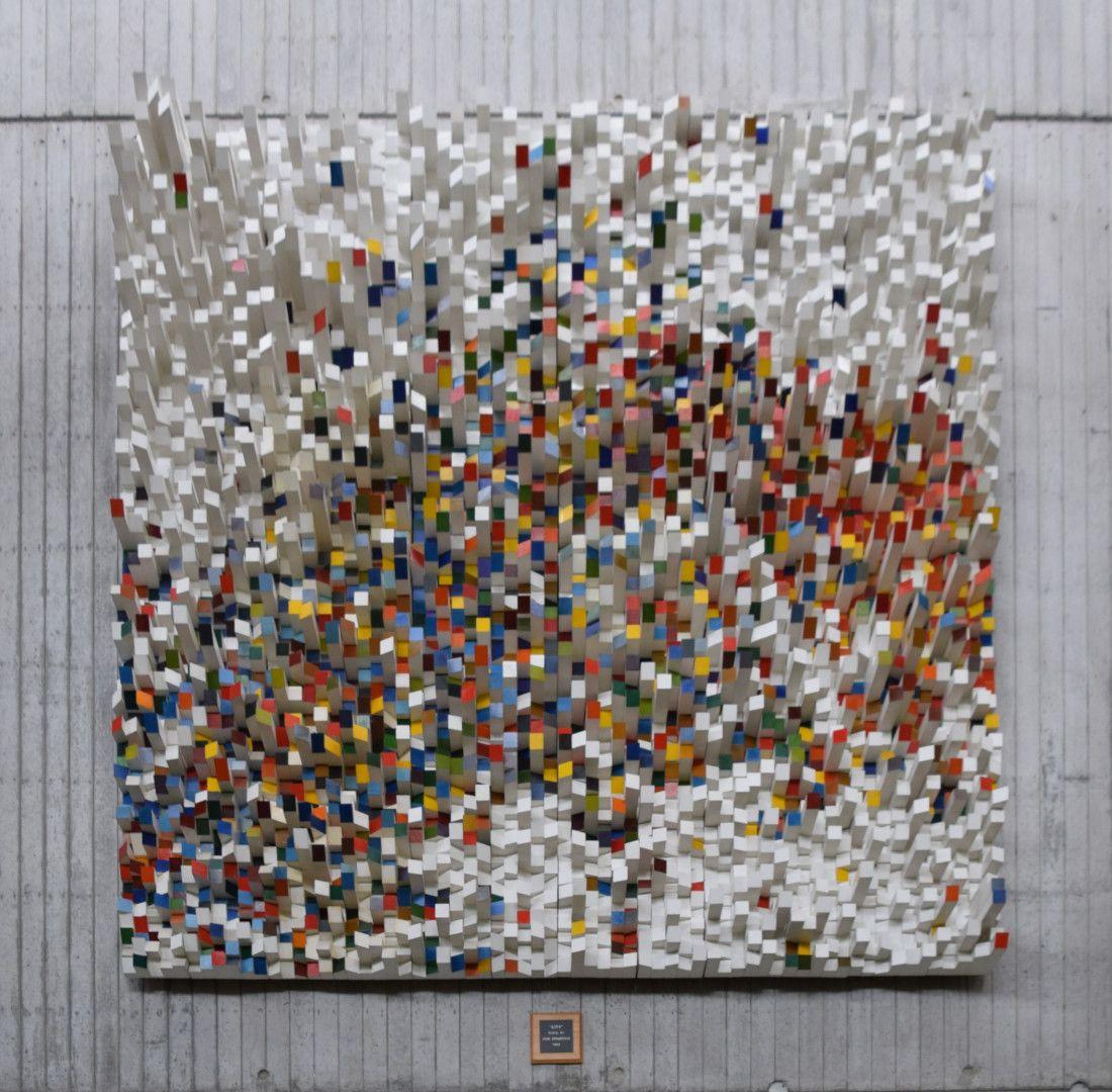 A relief mural this work is constructed from over 6,000 painted wooden blocks. Predominantly white, the blocks have been cut in an irregular pattern of heights. Some blocks have been trimmed square, others cut to an angle. Again in an irregular pattern the ends of the blocks have been picked out in saturated colours such as yellow, red, light and dark blue and green. The resulting composition is a dynamic optical construction which changes with every viewing angle.