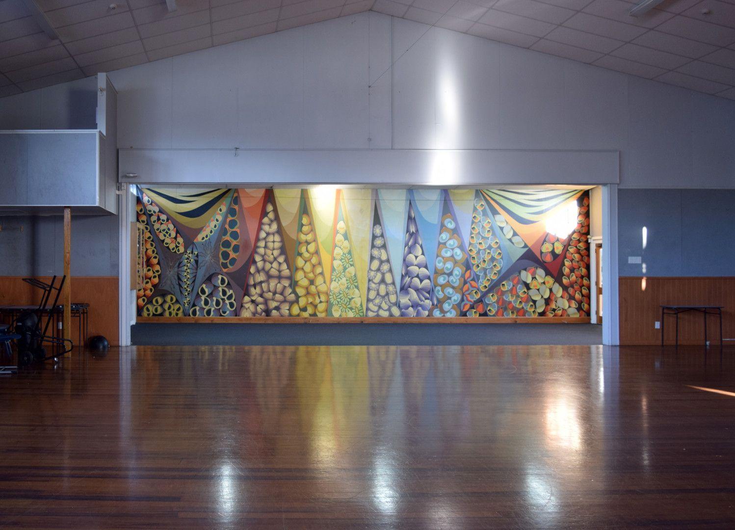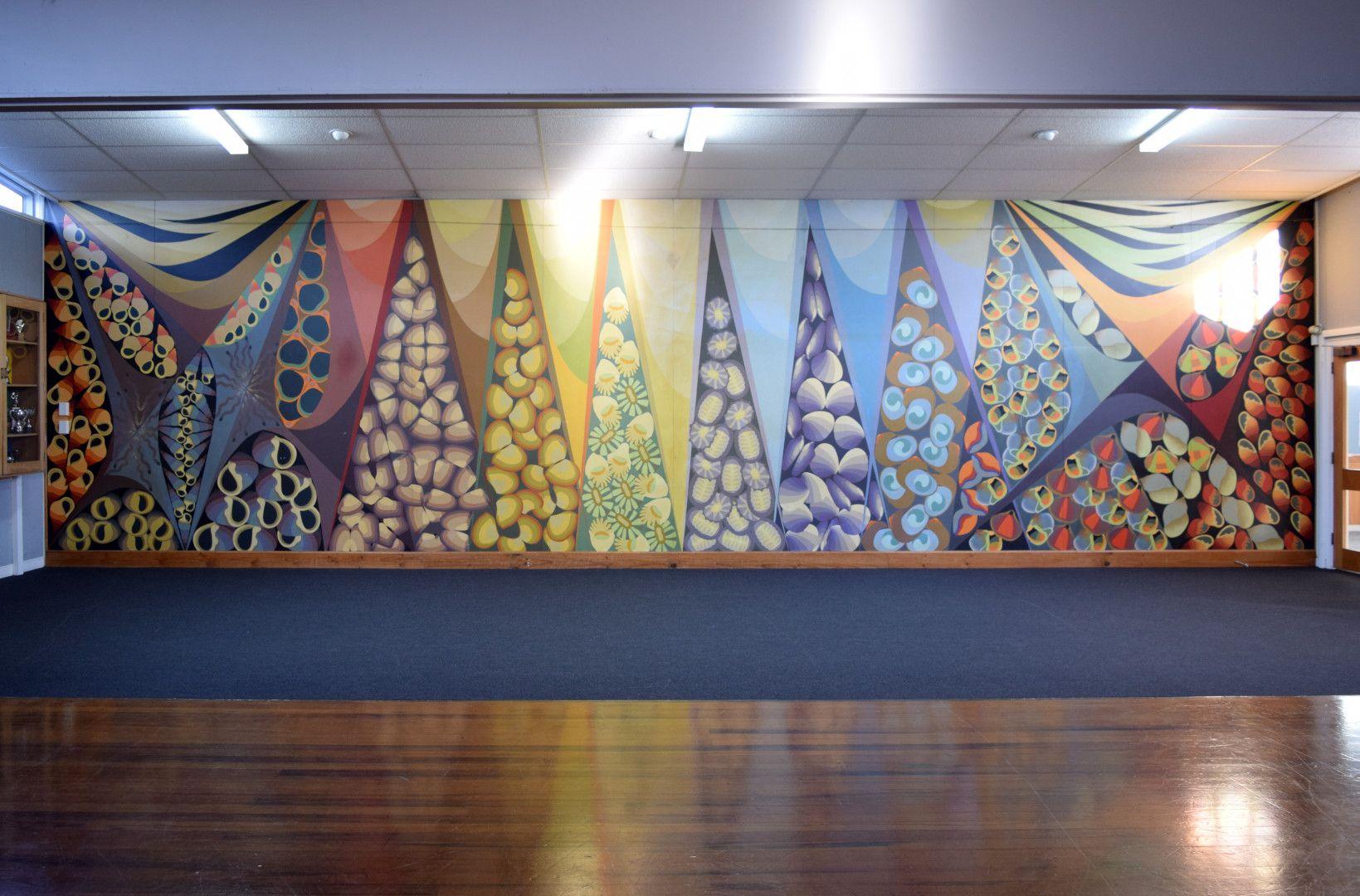 This mural was painted by artist John Hovell when he was a relieving art teacher at Huntly High School.