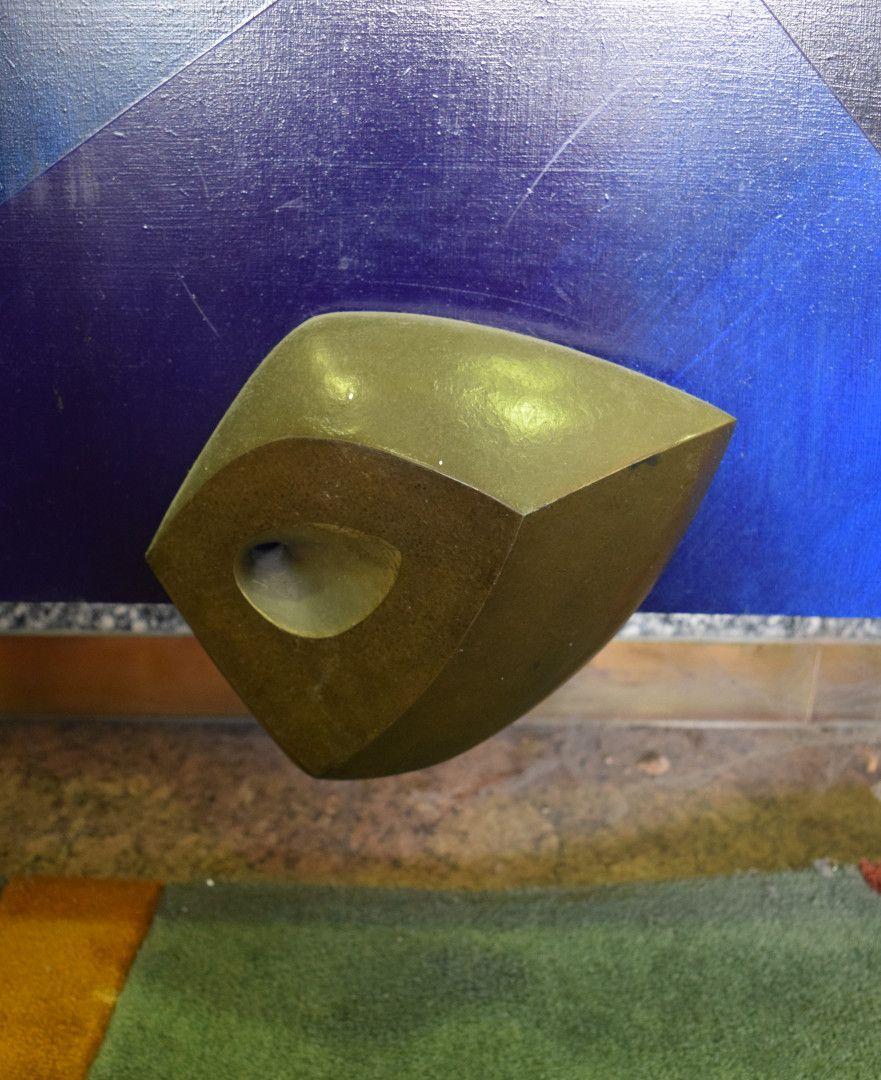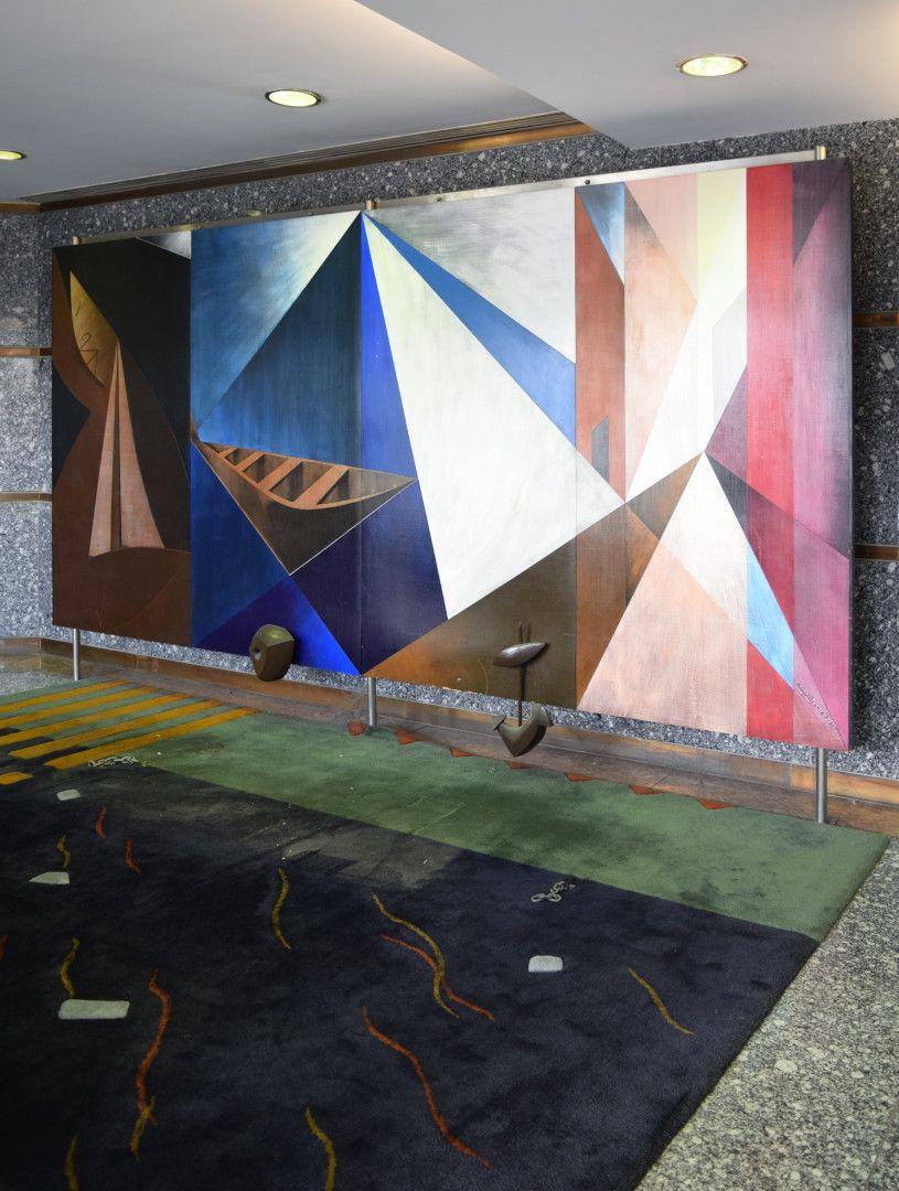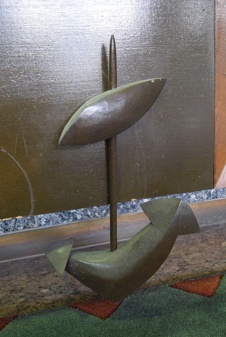 A large painting suggesting boats and buildings in a geometric play of light and darkness. Attached to the painting are two bronze sculptural forms - a Māori rock anchor (Punga) and a European sea anchor.